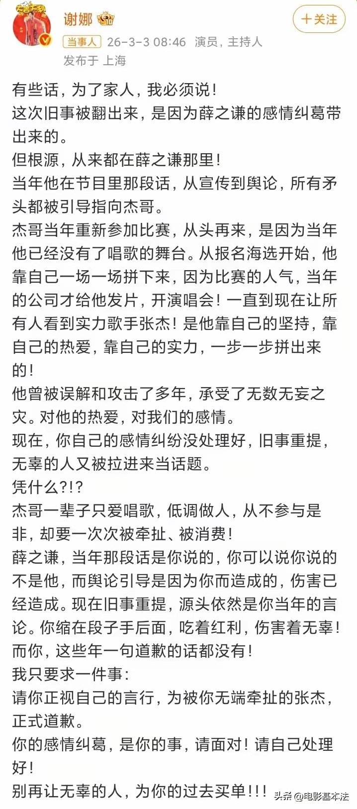 薛之谦事件越来越热闹了,谢娜也发声了,而且态度非常强烈,势要为张杰讨回公道的意思。原来薛之谦当年曾在《吐槽大会》内涵某歌手找到了一个有钱的女朋友帮他发唱片,但当时并未指名道姓。现在谢娜突然站出来回应,等于是自己对号入座,此地无银三百两,默认薛之谦当时内涵的就是张杰。不知道薛之谦说得是不是张杰,即使是张杰,薛之谦说得也是事实,没有谢娜,张杰出道都成问题,更不可能有现在这么红。谢娜就不应该这个时候跳出来,本来没什么事,这下好了,全网都开始帮她老公张杰回忆来时路了。另外关于张杰土这个问题,记得张杰那时有个外号“闰土”,这个外号怎么来的不清楚了,不过可以肯定不是薛之谦取得。