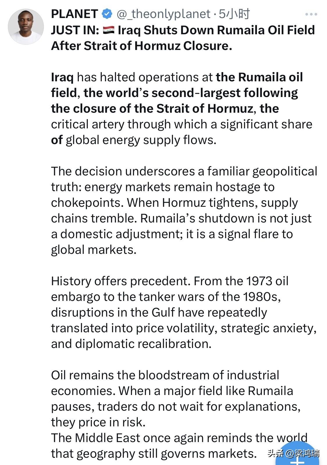 根据 2026 年 3 月 3 日的最新消息,受中东局势升级影响,伊拉克已正式开始关闭其最大的、也是世界第二大油田——鲁迈拉油田(Rumaila)的石油生产。 停产原因: 随着伊朗宣布封锁霍尔木兹海峡,国际航运中断导致油轮无法进入波斯湾港口装货。由于出口受阻,伊拉克南部的储油设施已达到饱和(库容见顶),被迫采取停产措施。 停产规模: 鲁迈拉油田: 该油田由英国石油公司(BP)运营,日产量约 150 万桶。目前南部油区已决定减产/停产 100%。 西库尔纳 2 号油田(West Qurna 2): 该油田也已开始关停,初期减产约 45 万桶/日。 后续影响: 总减产预期: 消息人士称,如果霍尔木兹海峡持续关闭,伊拉克准备在未来几天内将减产规模扩大至 300 万桶/日,约占其总产量的三分之二。 其他地区: 伊拉克北部的库尔德自治区也已宣布暂停通过土耳其杰伊汉港(Ceyhan)的石油出口。 市场反应: 受此连串供应冲击影响,国际油价在 3 月 2 日至 3 日期间大幅跳涨,布伦特原油已站稳每桶 80 美元关口,部分专家预测若封锁持续,油价可能突破 100 美元甚至更高。 目前,伊拉克军队已调遣装甲部队进驻巴士拉等南部产油区,以加强对油田及关键基础设施的安全防护。