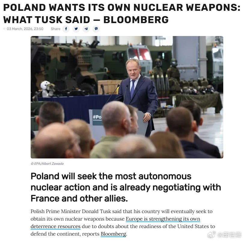 根據彭博社報道,波蘭總理唐納德·圖斯克表示,由於對美國保衛歐洲大陸的能力存疑,歐洲正在加強自身威懾力量,波蘭最終將尋求擁有自己的核武。