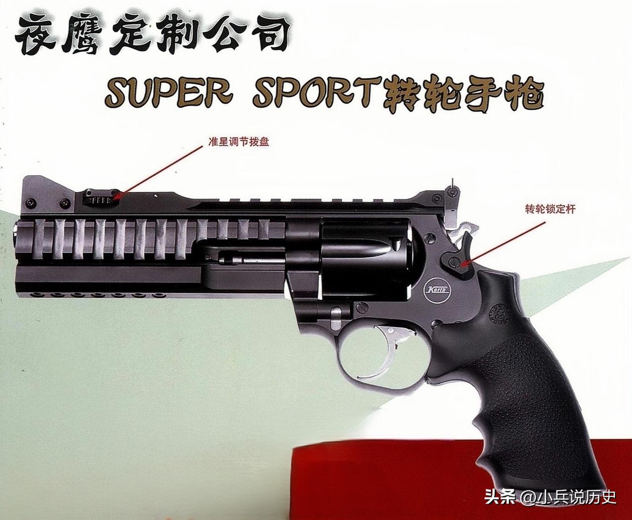 夜鹰定制SUPER SPORT转轮手枪 这款超竞运动左轮枪可是美德两大厂商联手的“硬核选手”,造出来0.357英寸口径的狠家伙! 外形霸气侧漏,全靠枪管全包防护套撑场面;还自带“外挂接口”,基座和护套上全是战术皮轨,想装瞄具、配件随便来,左轮圈里这么会“加接口”的可没几个! 导轨两头的瞄准件还能拧盘调高度,手残党也能轻松搞定。 枪管是威尔特厂的不锈钢冷锻款,152毫米长,弹仓能塞6发子弹,锁扣一推弹仓就甩出来,装弹退壳丝滑得很。 握把还贴心做了指槽和防滑纹,攥手里稳得一批,手感直接拉满!