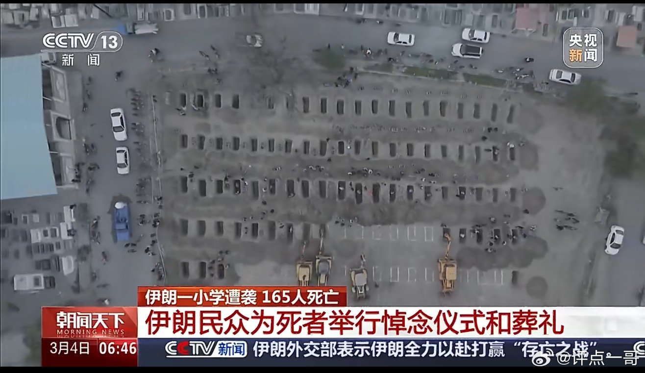 伊朗外长在社交媒体上转引墓地的航拍照片,“这些墓穴是为在美以空袭一所小学时遇难的160多名无辜女孩所挖,她们的身体被炸得支离破碎…” 伊朗遇难学生一个个墓穴让人心碎