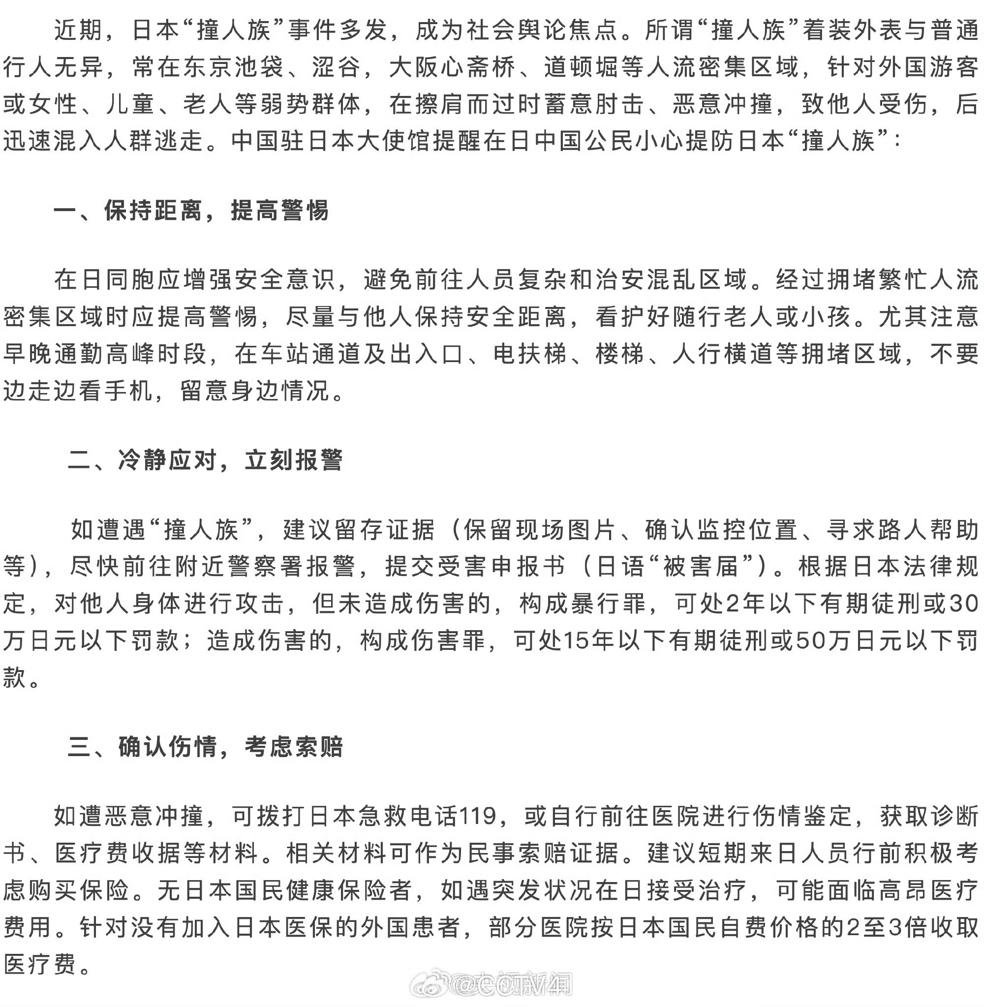中国驻日本大使馆提醒在日中国公民小心提防日本“撞人族”