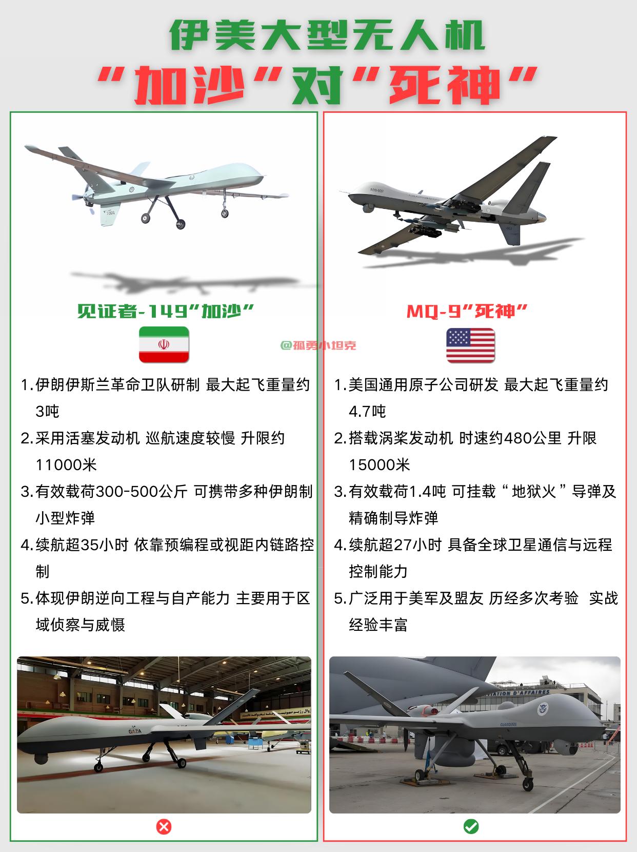 死神载重是加沙三倍,但战场上活下来才算数 把这两款无人机放一块看,技术代差确实明显,但有意思的是,伊朗那款反而在实战里混得风生水起。 1、先说硬指标。死神MQ-9最大起飞重量4.7吨,载荷1.4吨,能挂地狱火和精确制导炸弹,升限15000米,时速480公里,还有全球卫星通信撑着。加沙那边呢?3吨重,载荷顶天500公斤,带的还是伊朗自制小炸弹,升限11000米,速度慢一截,控制基本靠预编程。 2、但数据归数据,实战是另一回事。死神确实经验丰富,打过不少仗,可也经常被胡塞武装那种低成本防空撵着跑。加沙这玩意儿看着笨,但胜在简单皮实,飞个35小时不成问题,关键是便宜,打下来不心疼。 说白了,高端货有高端货的玩法,低端货有低端货的活法。够用就行,活下来才算数。