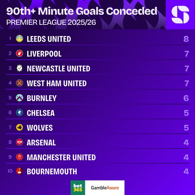 本赛季已有5 场英超因对手在90 分钟后进球而告负,这是英超历史上单季因补时丢球输掉比赛最多的纪录。