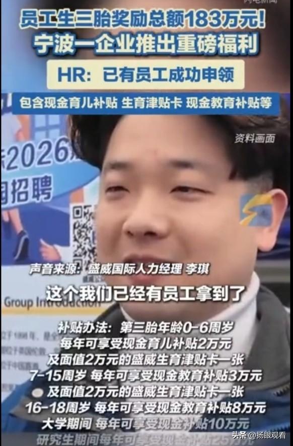 实名羡慕!宁波这家企业直接封神,生三胎最高奖励183万! 谁能想到,如今真的有企业把员工的生育顾虑放在心上,用实打实的福利温暖人心。近日,宁波一企业推出的生育奖励政策直接刷屏全网,让无数打工人直呼“这才是神仙公司”!根据企业公布的政策,员工生育三胎,累计最高可领取奖励高达183万元,这笔补贴并非一次性发放,而是从孩子出生开始,一直覆盖到研究生毕业,全程为家庭减轻育儿与教育压力。 从奶粉钱、早教费用,到上学后的学费、生活费,再到后续升学深造的支持,企业全方位兜底,真正解决了当代年轻人不敢生、养不起的核心难题。更让人感动的是,这项福利并非噱头,已有员工成功申领并拿到补贴,用实际行动证明了企业的诚意与担当。 在很多人因经济压力对生育望而却步的当下,这家企业没有空谈口号,而是以真金白银支持员工,既体现了对员工的人文关怀,也彰显了企业的社会责任感。消息一出,立刻引发网友热议,大家纷纷表示“太羡慕”“想入职”,不少人感慨,这样人性化、有温度的公司,才是打工人真正向往的职场归宿。 尊重员工、守护家庭,这样的企业不仅留得住人心,更值得被点赞!