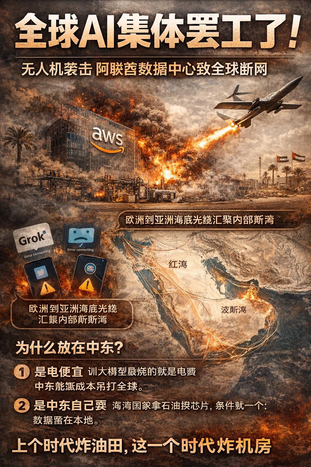 昨晚全球AI集体罢工了。 原因是一枚无人机,砸中亚马逊云阿联酋数据中心的电力设施,导致消防系统自动接管,强制断电。 Claude挂了,Grok挂了,跨国银行App也都挂了。 当时第一反应是,我用的Grok是美国服务器,中东炸了跟我有半毛钱关系。 中东早就不只产油了,它是数字世界的苏伊士运河。 欧亚主干光缆全部汇聚在红海和波斯湾。 所以阿联酋节点一断,相当于高速公路核心立交桥塌了。 为什么放在中东? 1. 是电便宜。训大模型最烧的就是电费,中东的能源成本吊打全球。 2. 是中东自己要。海湾国家拿石油换芯片,条件就一个:数据留在本地。你想做这门生意,机房就得盖在沙漠里。 上个时代炸油田,这一个时代炸机房。 战争逻辑变了。 爆料