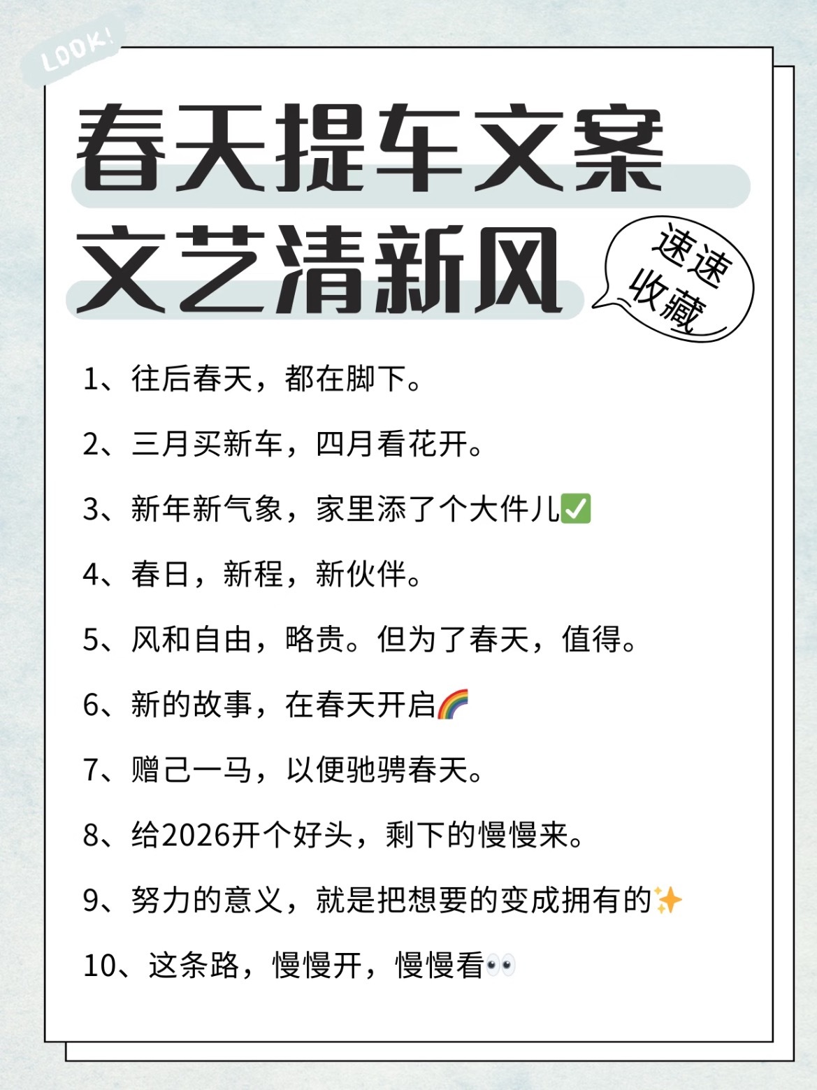 三月已至,近期有没有要提车的小伙伴呀~朋友圈超可爱文案给大家准备好咯文艺清新风1、往后春天,都在脚下。2、三月买新车,四月看花开。3、新年新气象,家里添了个大件儿✅4、春日,新程,新伙伴。5、风和自由,略贵。但为了春天,值得。6、新的故事,在春天开启🌈7、赠己一马,以便驰骋春天。8、给2026开个好头,剩下的慢慢来。9、努力的意义,就是把想要的变成拥有的✨10、这条路,慢慢开,慢慢看👀幽默可爱风1、滴!您的春日座驾已送达🚗💨2、春天送给自己的第①份惊喜3、驾照考了三年,终于用上了💪4、恭喜我司(本人独资)喜提公务用车一辆。5、有点紧张,大家离我远点。6、上班暂停,先提辆车~7、沉浸式拆封新车☺️8、生活不会亏待认真搬砖的人🧱9、以后请叫我🗣️方圆五十里想去哪就去哪选手🏃10、走,我带你啊🙆♂️我与汽车的日常大v聊车