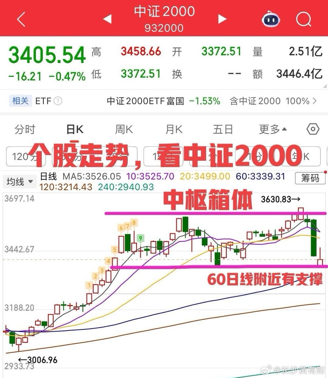周三午评: 亚太股市崩了,A股能扛得住吗? 今天大A相对于亚太其他市场还是挺能扛的了,日经大跌超4%,韩大跌超11%,包括港股今天继续大跌接近3%,只能说最近金融市场外患影响还是比较大的。 技术面看,上证指数处于一个调整周期,日、周线顶背离,所以短期调整不会这么快结束,今天的低点4061大概率是守不住的,还会破,不过短线来看,再往下走也不会怕了,60日线附近以及4000点是强支撑区,一次性跌破的概率也是很难。 从结构上来看,如图,从4197开始的向下走势,当前未出现止跌迹象,不过大概率会在60日线附近构建一个小中枢,如图所示,完成中枢在中枢的下方是一个相对安全的位置,所以,耐心等待止跌。 中证2000与上证指数同样的逻辑,大概率会在60日线附近构建一个小中枢。 总的来说,调整未结束,但大概率在60日线附近会做一个缓冲,即构建中枢,关键看下午破4061,只要不走加速,有条件往回收,但不是调整结束,只是缓一缓下跌的速度。 个人观点,仅供参考!