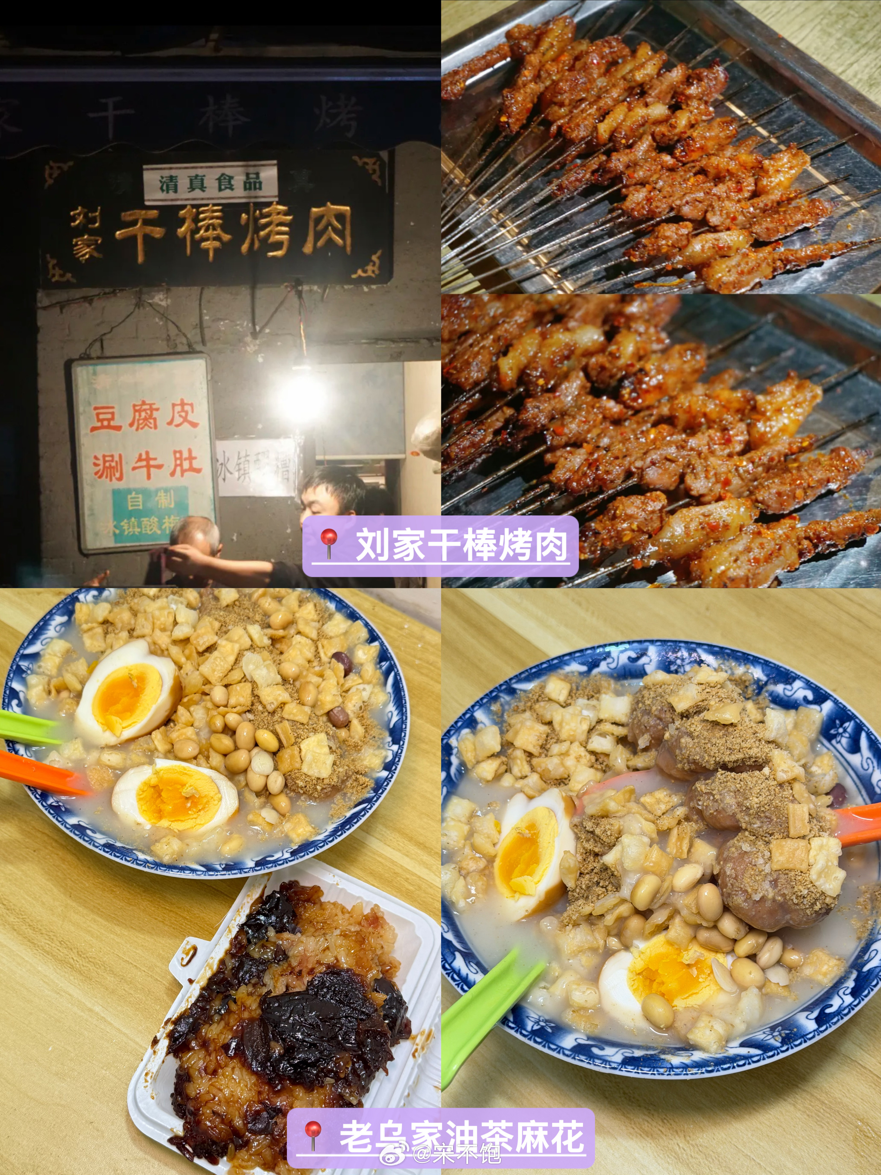 回民街:① 马洪小炒泡馍馆② 刘信牛羊肉泡馍小炒/建娃小炒泡馍③何老二卤汁凉粉/宏顺祥卤汁凉粉/盛志望麻酱酿皮铺④志亮灌汤蒸饺/贾三灌汤包⑤ 邢老三肉丸糊辣汤/清真石家包子⑥ 刘家干棒烤肉/老乌家油茶麻花⑦ 东南亚甑糕/彦彬元宵⑧马治钢玫瑰多仁油糕/西北伊兰手工烤馍店⑨ 马志善稀糊爛生熟肉店/马孝托托馍①⓪果园红豆柿饼糕/佳宝甜食