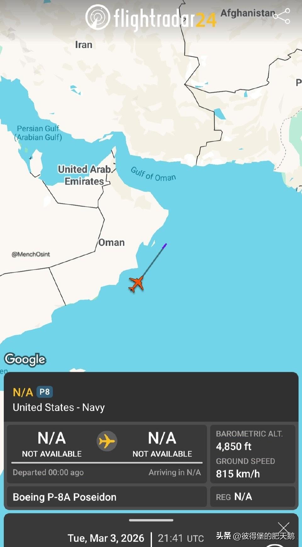 #以美袭击伊朗# 目前,美国海军的P-8A海上巡逻机正在阿拉伯海上空活动, 位于伊朗以南约600-700公里处。 豪不夸张地说,这是自战争开始以来,第一次看到它在那样的低空执行任务。 它在寻找什么? #伊媒称哈梅内伊之子被选为新任最高领袖#