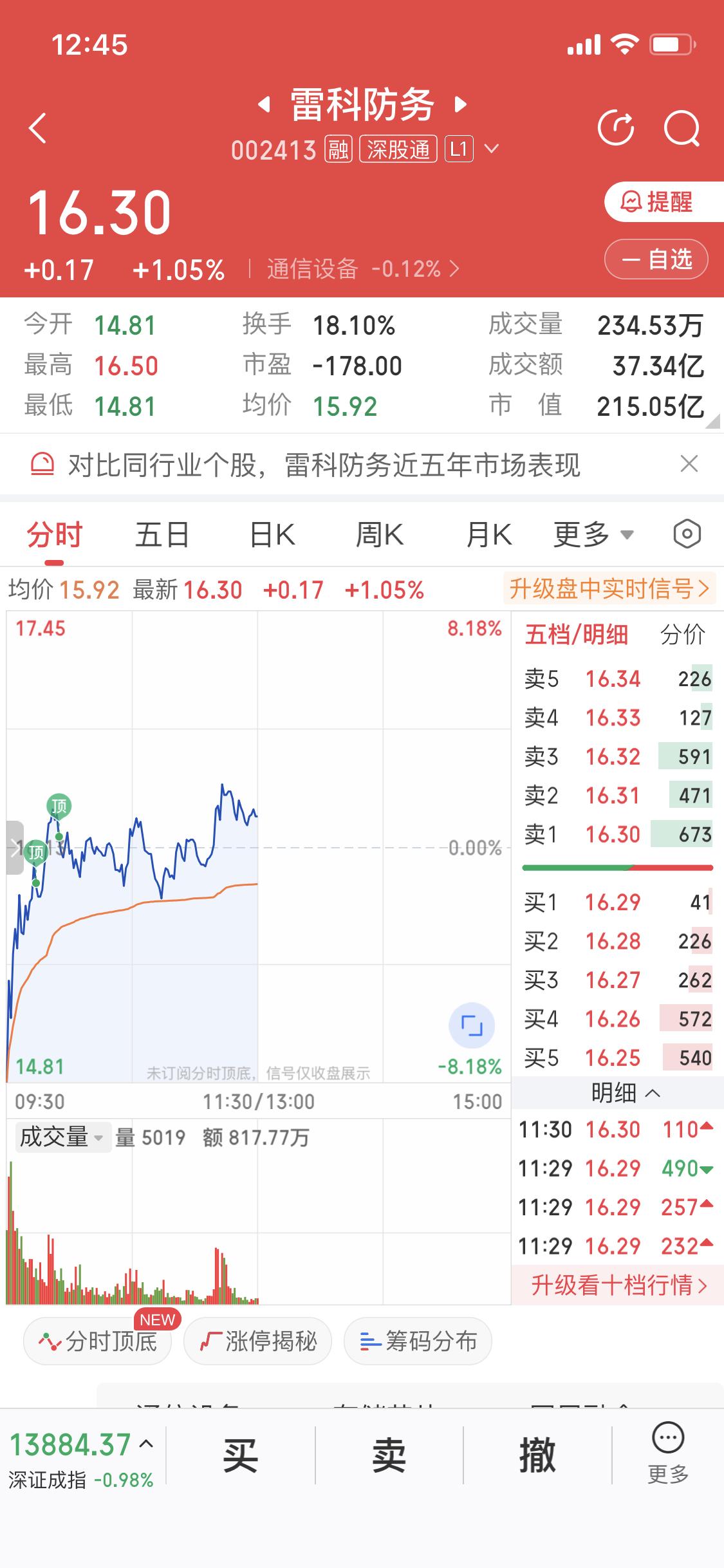3月4日早盘雷科防务低开,不过迅速从水下拉到水面,感觉有资金承接,下午说不定要大涨。 雷科防务(002413)业务涵盖雷达、智能弹药等多个业务群,涉及边缘计算、人工智能等众多概念。 2月26日1月16日它还经历过深度回调,此前27个交易日股价从8.25元飙升至20.29元,成了军工电子赛道“妖股”。3月2日它涨停,开盘15.48元,收盘16.36元,成交额29.14亿元。 涨停原因一是中东地缘局势升级,二是东部战区军事演习,都提振了军工板块情绪。 就看今天下午能不能延续这波势头了。