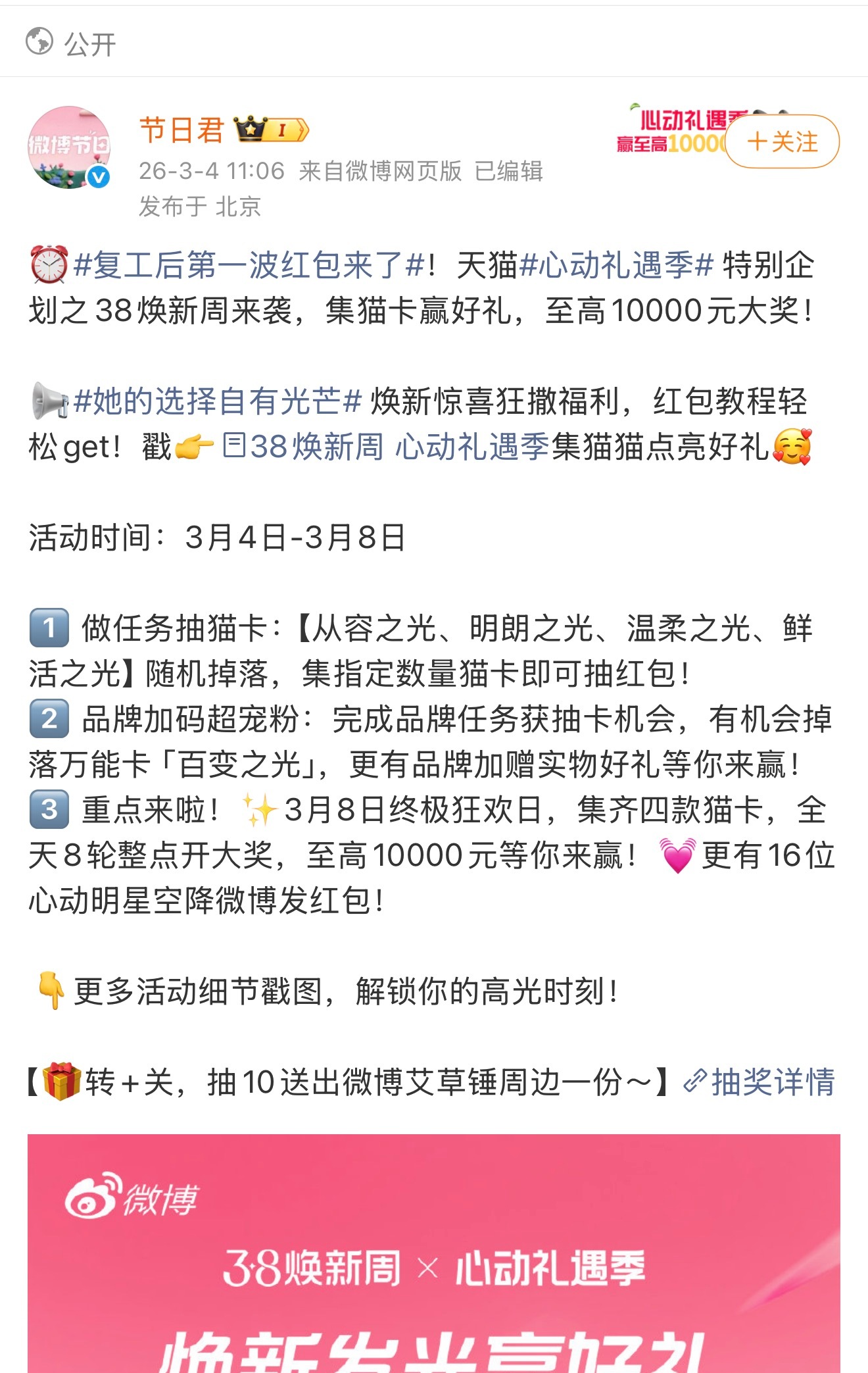晒出属于你的光 天猫联合微博在38妇女节有个抽卡活动,3月4日-3月8日,参加活动至高可获得【万元】大奖,做任务抽猫卡,随机获得“从容之光/明朗之光/温柔之光/鲜活之光”四款猫卡,集齐指定数量就可以抽