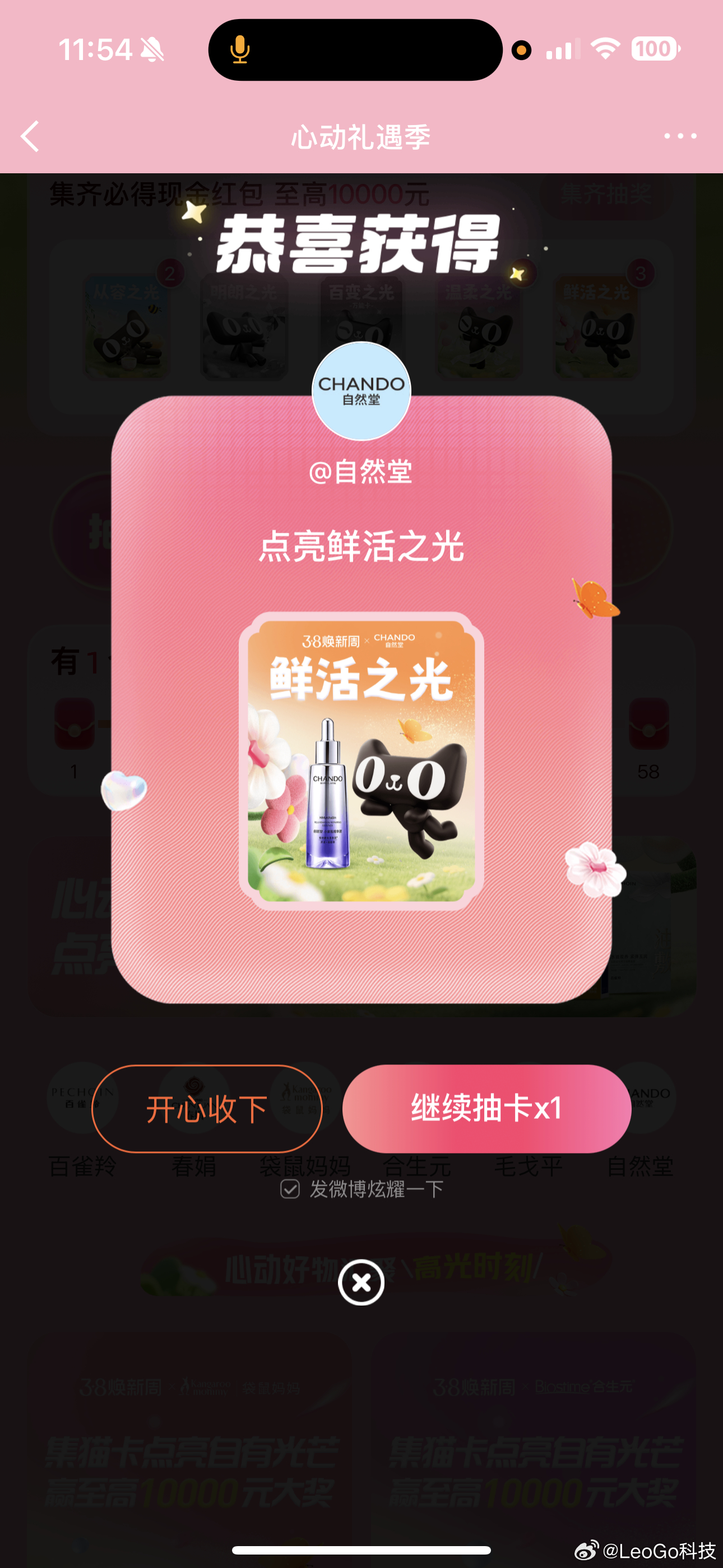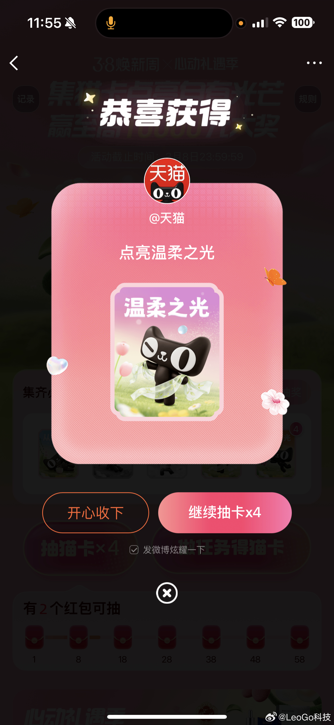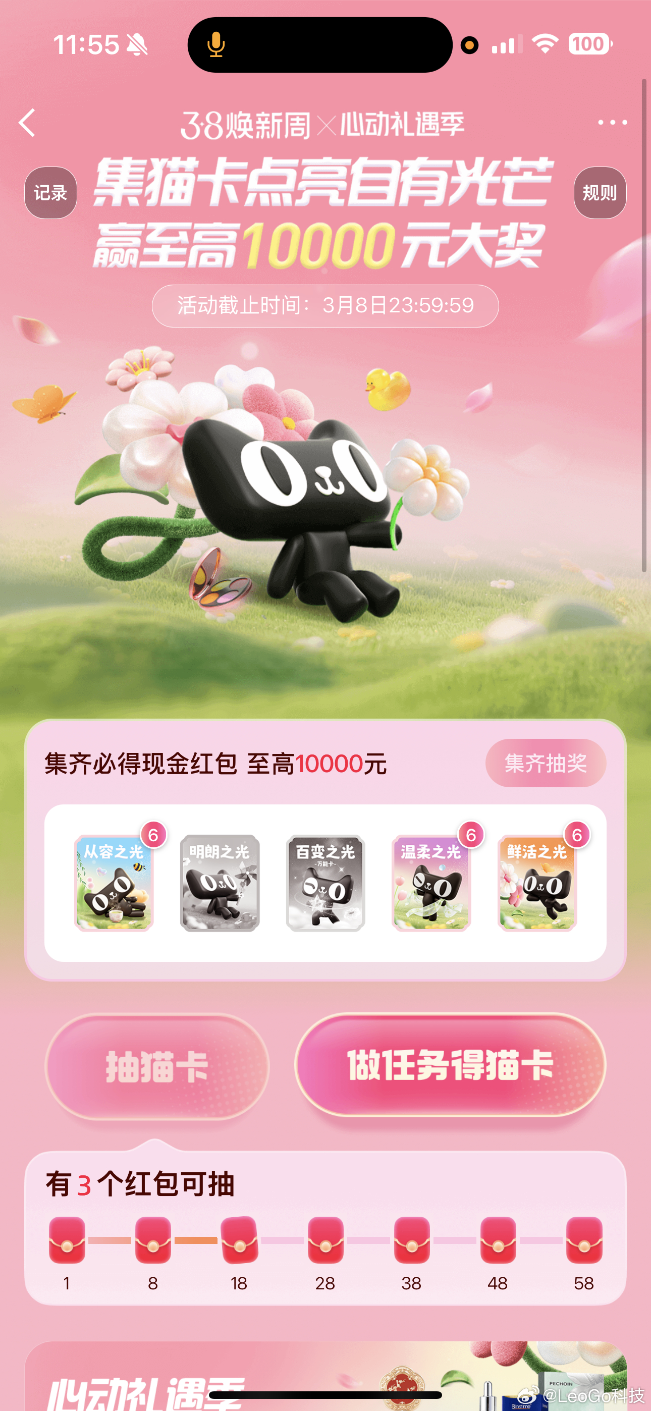 简单说下玩法:做任务就能拿猫卡——发微博、关注账号、转赞评、逛品牌主页和天猫会场,都能抽卡。集齐从容/明朗/温柔/鲜活四张,就能参与抽万元大奖!【百变之光】是万能卡,可以转化成任意一张你没抽到的卡,去品牌主页逛逛或者转赞评博文都有机会拿到~