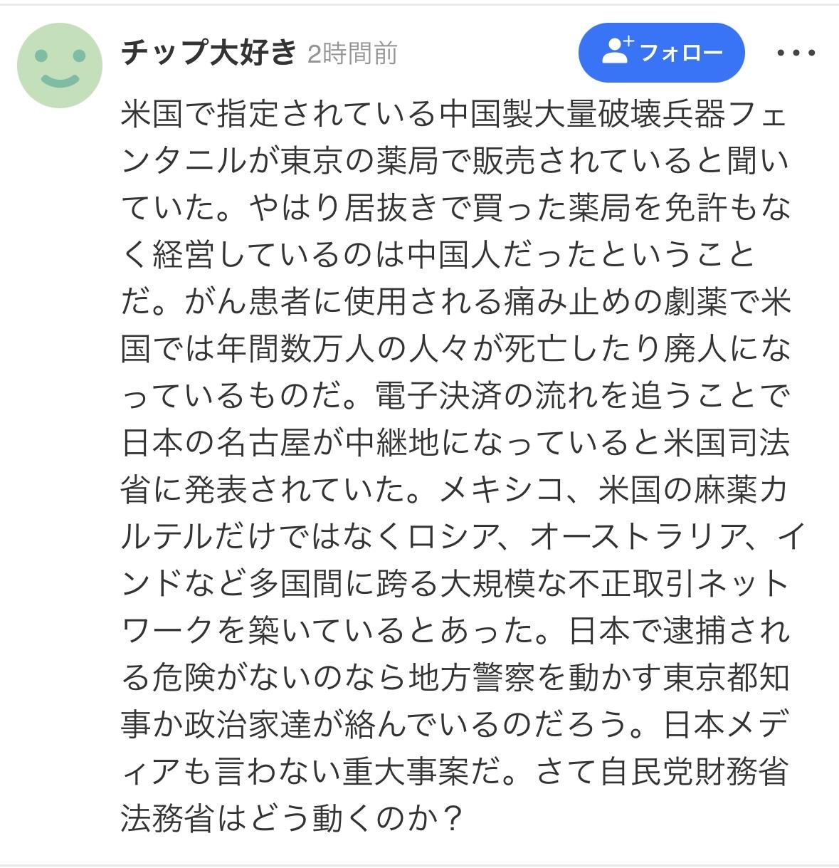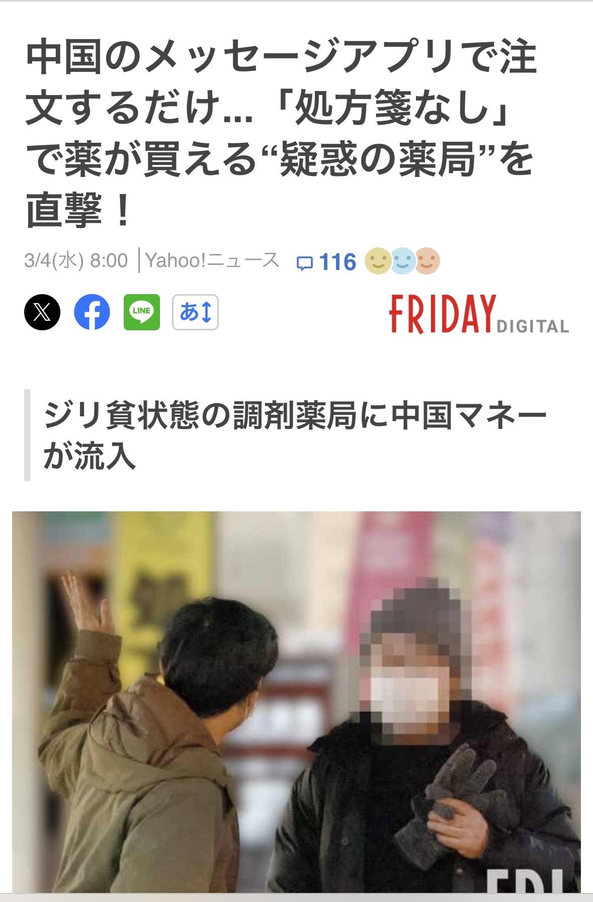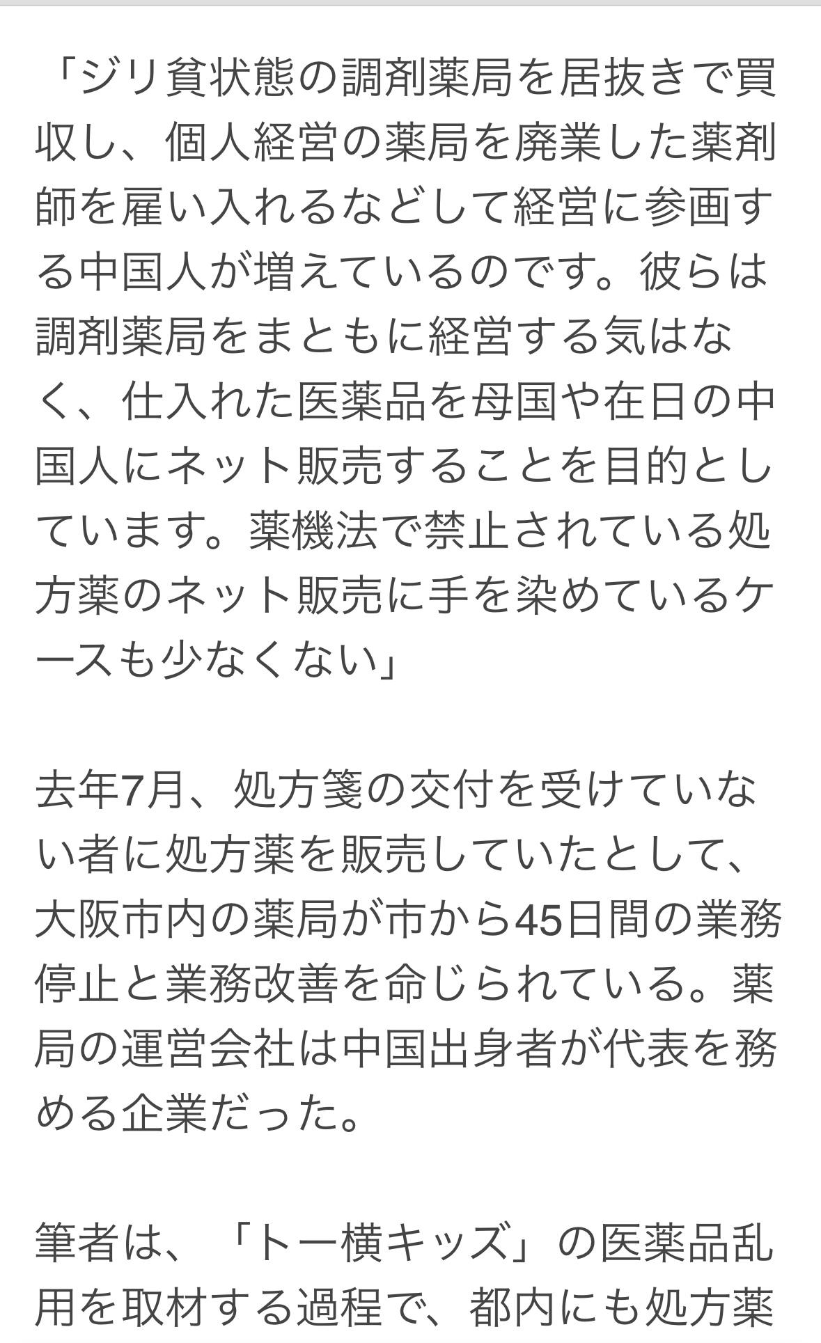 "来这里干什么?和你没关系!滚出去!” 二月中旬的一个早晨,东京新宿区一栋公寓楼里的药房传来一位中年妇女尖锐而愤怒的声音。她的日语口音明显是中文。记者发现这家药房疑似非法销售处方药前去调查,结果就遇到了这一幕。 越来越多的中国人通过收购经营不善的处方药房,并聘用离职的药剂师来参与药房的经营。他们无意妥善经营药房,而是将从网上购买的药品出售给身在国内或居住在日本的中国人。在很多情况下,他们还从事处方药的网上销售,这就违反了《药品和医疗器械法》的规定。 记者获得了这些非法药店的微信账号,并用中文联系他们,假装想要购买药品。虽然很多账号都心存疑虑,没有回复,但有一个账号回复了记者。问道:你想要什么?记者询问了常用处方药的库存情况,例如Relenza、Tamiflu和抗生素。他们表示都有现货,最终订购了盐酸曲马多,一种用于癌症患者的止痛药。由于它能给使用者带来独特的迷幻体验,因此在海外被视为一种入门毒品,¥14000日元。运单上的物品名称为“保健品”,这表明对方明知交易的非法性。 之后,记者向这家药店的运营公司发送了一份关于非法销售处方药的调查问卷。然而,记者没有收到回复,反而收到了律师的“通知”。通知中写道:目前,根据新宿区公共卫生中心的指导,我们正在严格执行处方药的合法销售,我们不会回应贵公司的任何采访或提问。甚至威胁要对记者以及杂志采取“刑事和民事诉讼”。 记者将这家药店的非法活动信息以及在采访中获得的证据提交给了新宿区公共卫生中心卫生科。