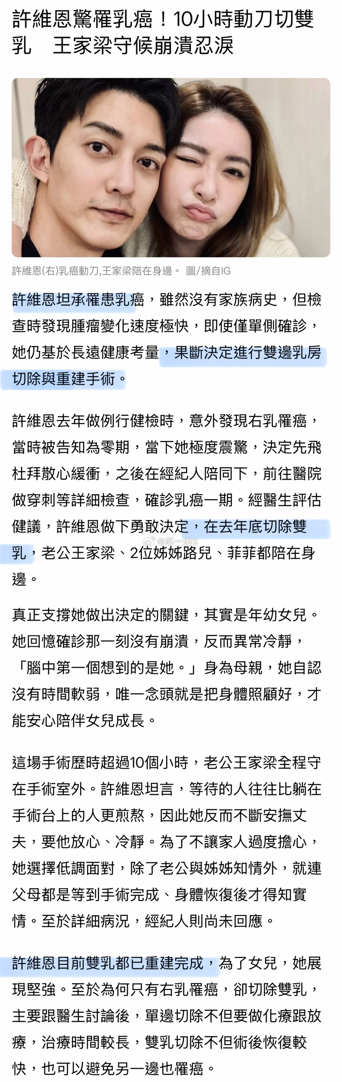 许维恩透露她得了乳腺癌,已经切除双边乳房并且完成重建手术👇