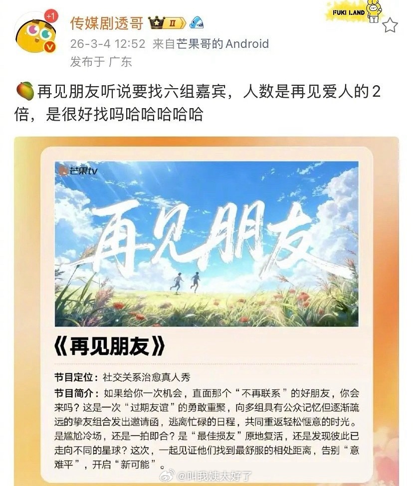 芒果还挺听劝的,已经开始着手准备《再见朋友》这个节目了。感觉《再见朋友》比《再见爱人》还让人意难平,好好选选行吗