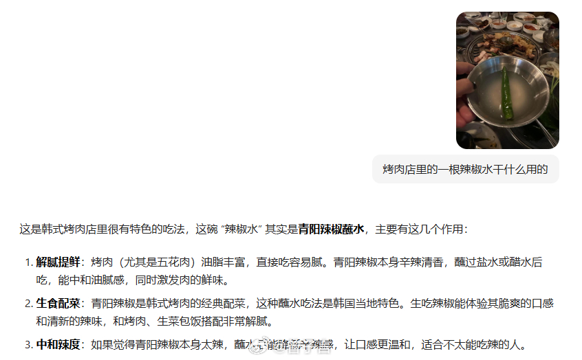 我也挺好奇烤肉店为什么会有辣椒水,问了一下豆包: