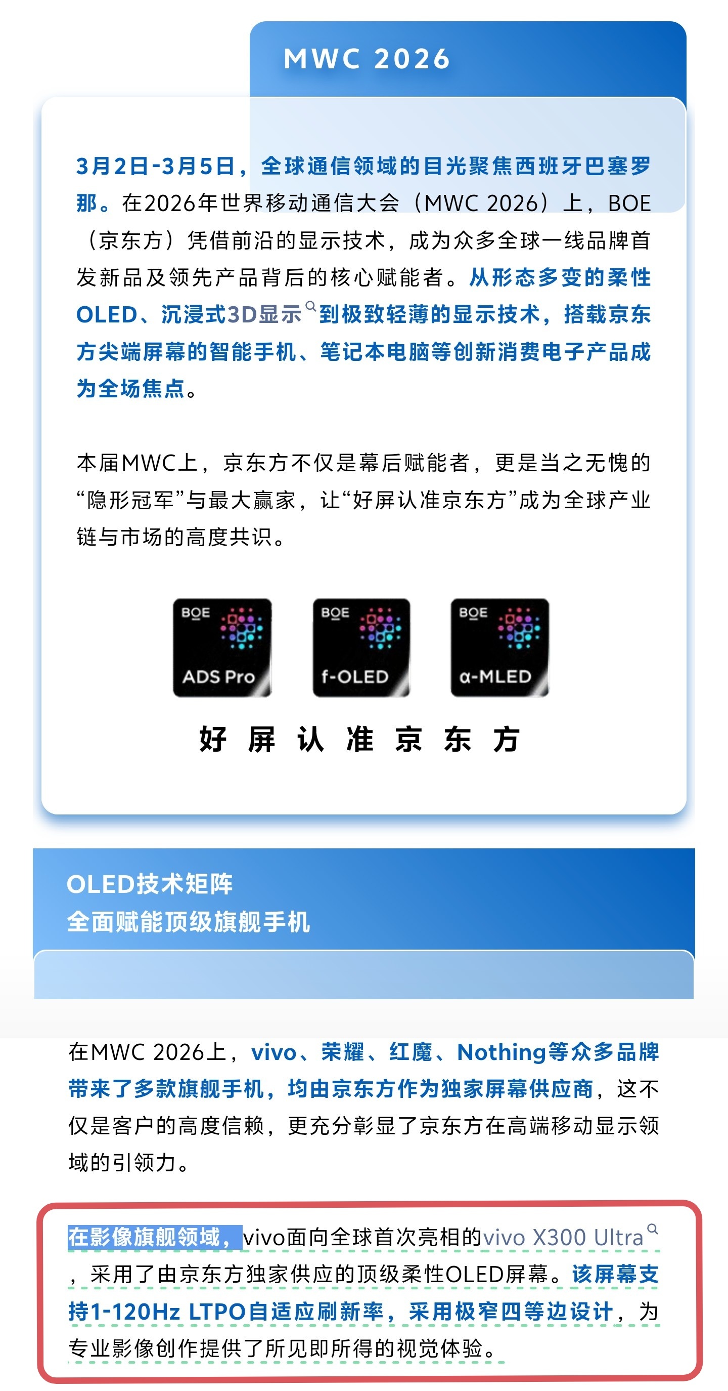 MWC哪些科技指明了未来 这次MWC 2026上,京东方也大放光彩,有形态多变的柔性OLED、沉浸式3D显示以及极致轻薄的显示技术,可以说搭载京东方尖端屏幕的智能手机、笔记本电脑等产品成为全场焦点