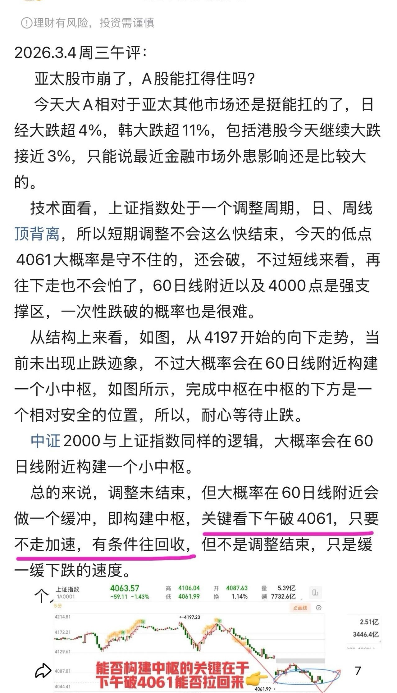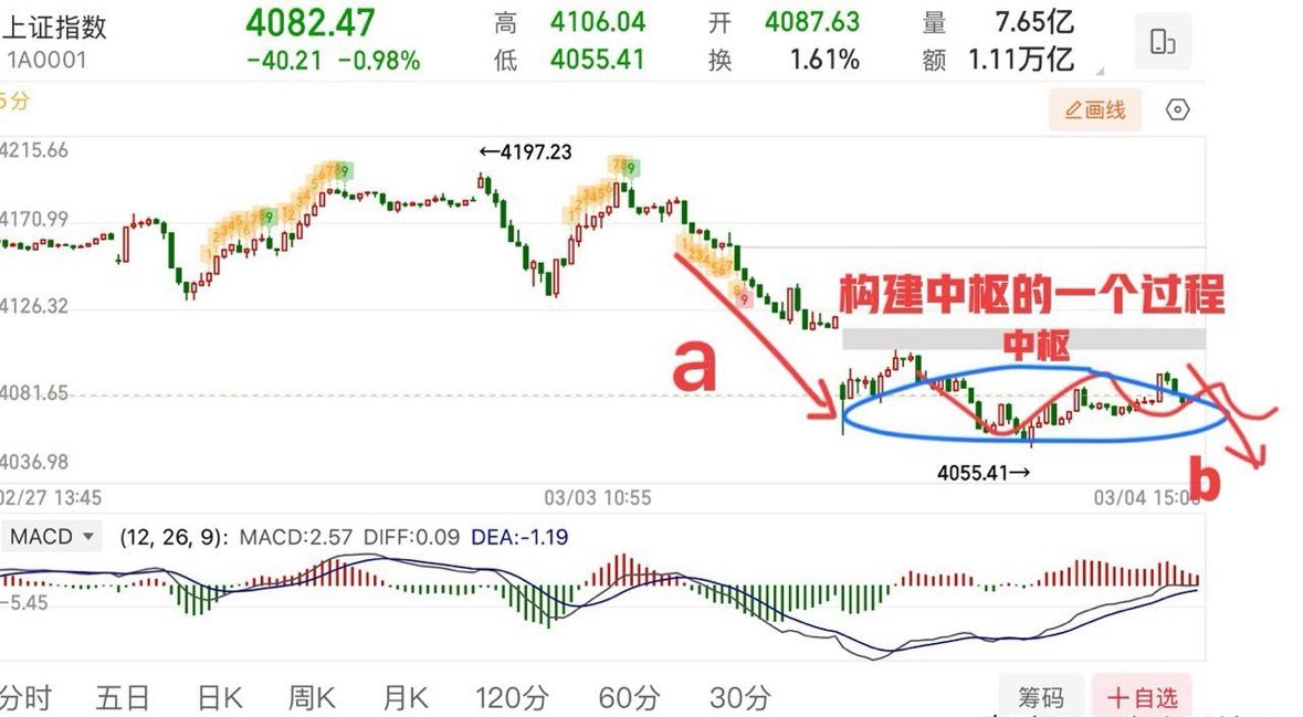 下午破4061后有一个弱反抽,实际上就是构建小中枢的一个过程,算是一个下跌缓冲降速的一个过程,调整未结束。小级别上看,小中枢形成之后,再观察往下的空头力度与速度,与第一段进行比较,如果往下速度弱于前下跌段则还会有回拉的过程,压力上方的均线以及缺口(4006)。