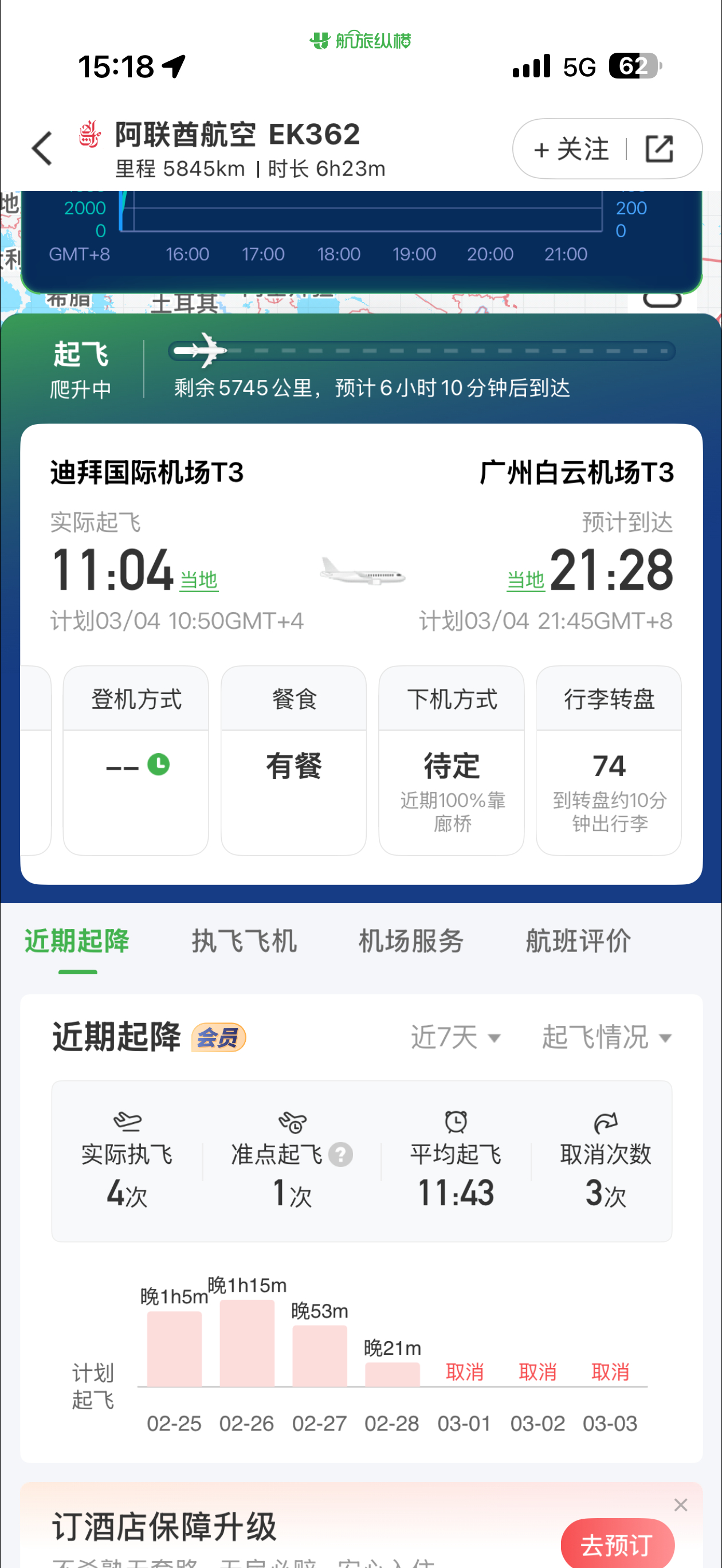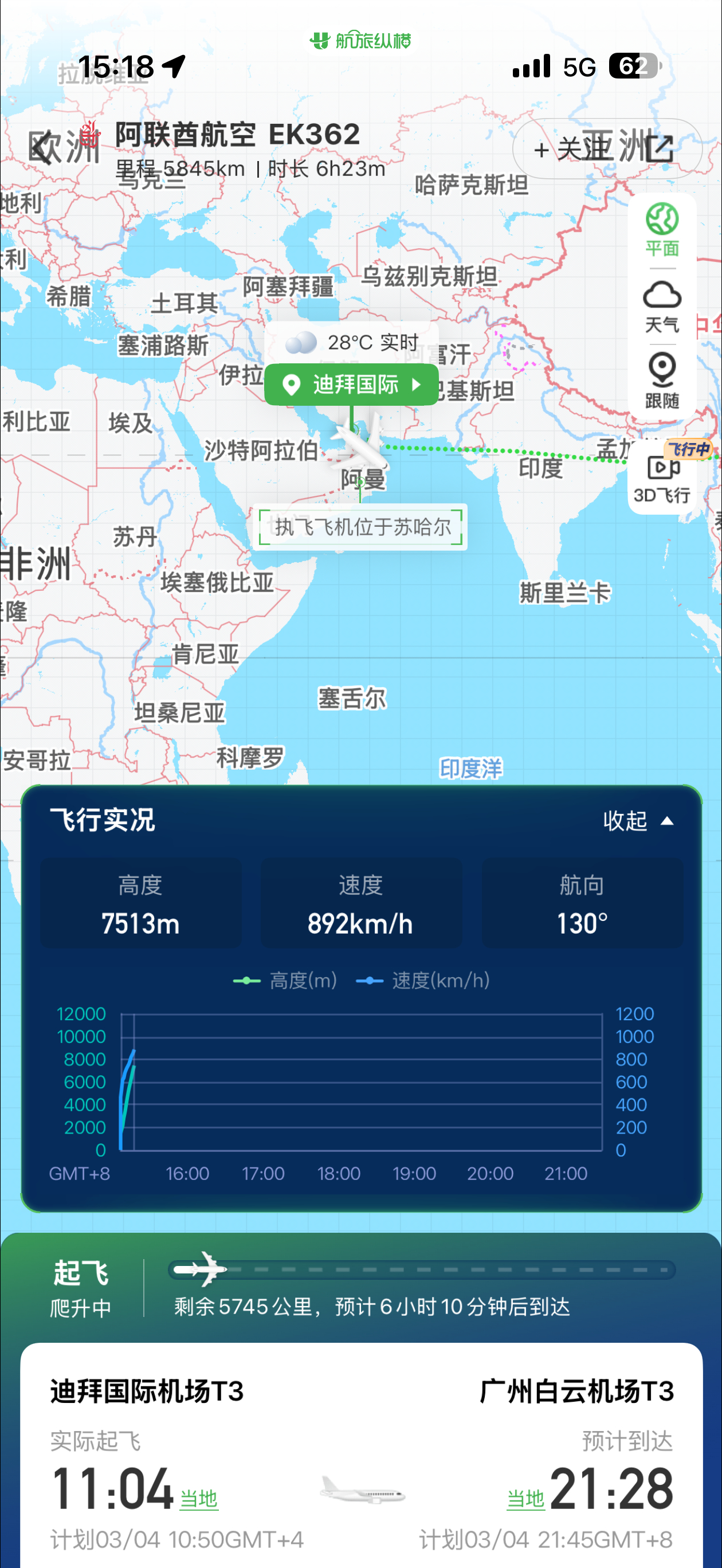 中东局势彻底失控终于有迪拜的航班飞回中国了!阿联酋航空的EK362已经顺利起飞马上到巡航高度了波音777-300ER,满载能拉300人左右今晚9:30就到广州了估计上面都是急切回家的同胞们 深圳