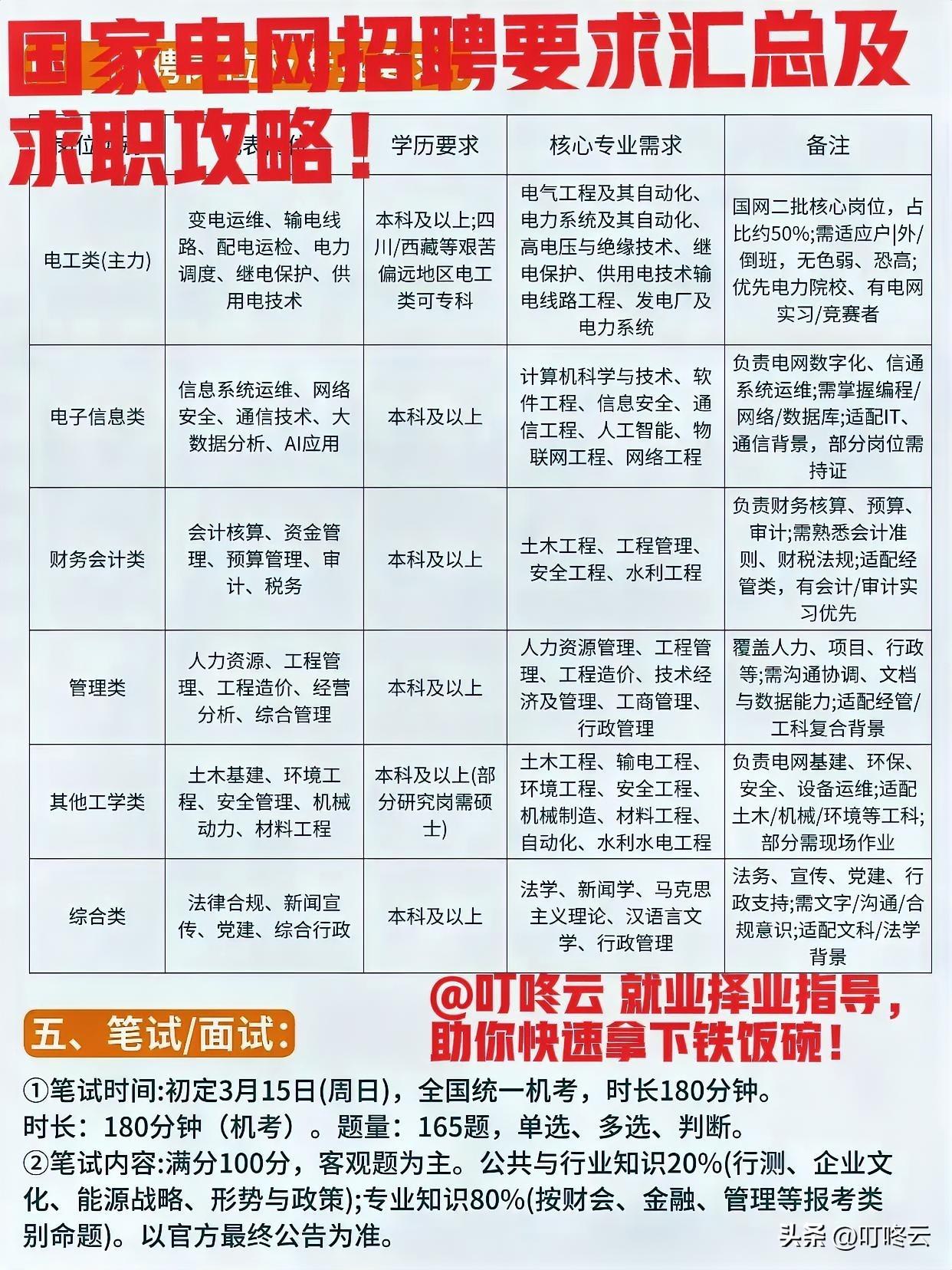 国家电网招聘一般有哪些要求? 国家电网招聘要求汇总和求职攻略!2026国网求职通关指南:电网offer不是梦!🔥 @叮咚云 帮你解读重点和职业指导:2026年国家电网招聘的“入场券”已经就位,想端稳这个“金饭碗”,先把这份通关秘籍焊在脑子里![点亮平安灯][点亮平安灯][燃烧的心][燃烧的心] 从历年招录数据看,电工类岗位是绝对C位,占比超50%,堪称“电网亲儿子”。电气工程、电力系统自动化等专业的同学,只要学历达标(本科及以上,川藏等艰苦地区专科也能冲),再加上无弱色、恐高的“硬核体质”,基本就是半只脚迈进电网大门。而电子信息、财务会计等赛道,虽然竞争激烈,但只要手握IT、会计证书,也能杀出重围。[赞][赞] 笔试是“拦路虎”?别怕!3月15日的全国统考,165道题看似“题海战术”,实则“二八定律”——专业知识占80%,公共与行业知识仅20%。只要把专业知识啃透,行测、企业文化这些“送分题”根本不在话下。记住:“千淘万漉虽辛苦,吹尽狂沙始到金”,刷题刷到吐,上岸就有谱![点亮平安灯][点亮平安灯] 想脱颖而出?除了硬实力,还要有“软实力”。优先选择电力院校,有电网实习或竞赛经历的同学,直接“buff叠满”。管理类、综合类岗位则需要“能说会道”,沟通协调、文档处理能力拉满,才能在众多竞争者中“C位出道”。[汤圆][汤圆] “长风破浪会有时,直挂云帆济沧海”,2026国网求职季,只要找准赛道、全力以赴,下一个“电网人”就是你![奥特曼][奥特曼] 欢迎关注@叮咚云 将优先为粉丝职业规划指导,为你定制最适合的就业择业方案!欢迎留言交流讨论。[来看我][来看我] 免责声明:图片来自网络,仅供参考 国家电网求职 国网提前批招聘 电网招考