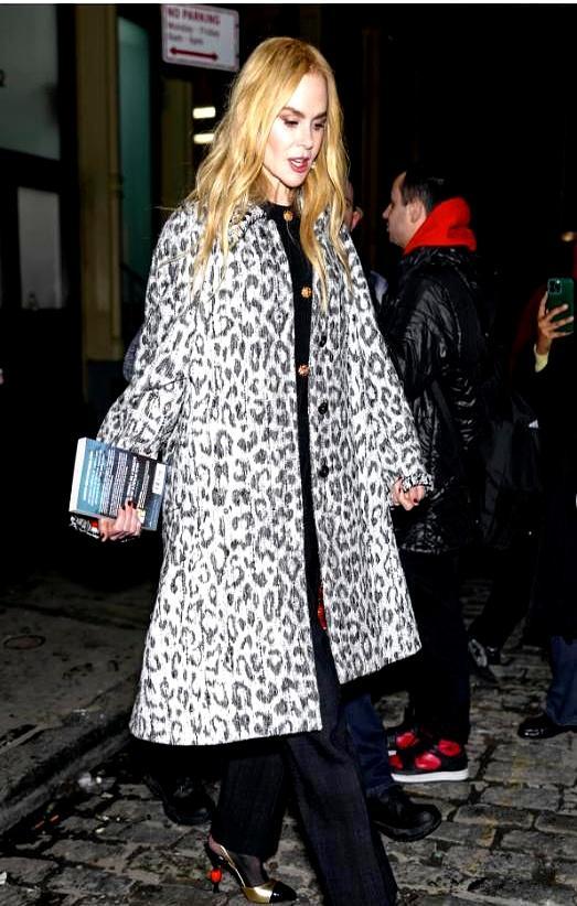 58岁穿豹纹上街,她疯了吗? 纽约SoHo的冷风里,妮可·基德曼甩开那件香奈儿灰豹纹大衣,像扔出一张挑衅的牌。黑丝袜裹着细跟单鞋,鞋跟上那颗红色爱心晃得人眼晕。她不是去喝咖啡,是去92街Y和杰米·李·柯蒂斯对谈新剧——两个女人,两身豹纹,像赴一场隐秘的狩猎。 你细看那件粗花呢。2026早春系列,新总监马修·布莱兹的手笔。每一缕金线都在说:经典不是供起来的瓷器。她上午刚录完《吉米肥伦秀》,一身Khaite黑皮革还带着摄影棚的强光,下午就换豹纹坐进Bibliothèque酒吧。58岁的行程表比华尔街交易员还密。 她把年龄穿成了武器。不是对抗,是戏耍。金色卷发下那张脸依然锋利,但眼角笑纹里藏着一整个好莱坞的黄昏与黎明。网友刷着“野性十足”的标签时,她早拎着大衣拐进了下个街角。 岁月从不败美人,岁月只败怯懦的人。豹纹不是年轻的特权,是心跳的勋章;皱纹不是时光的债务,是故事的年轮。她踩着的不是一双鞋,是一句宣言:我依然敢在人群里,做最响的那声心跳。