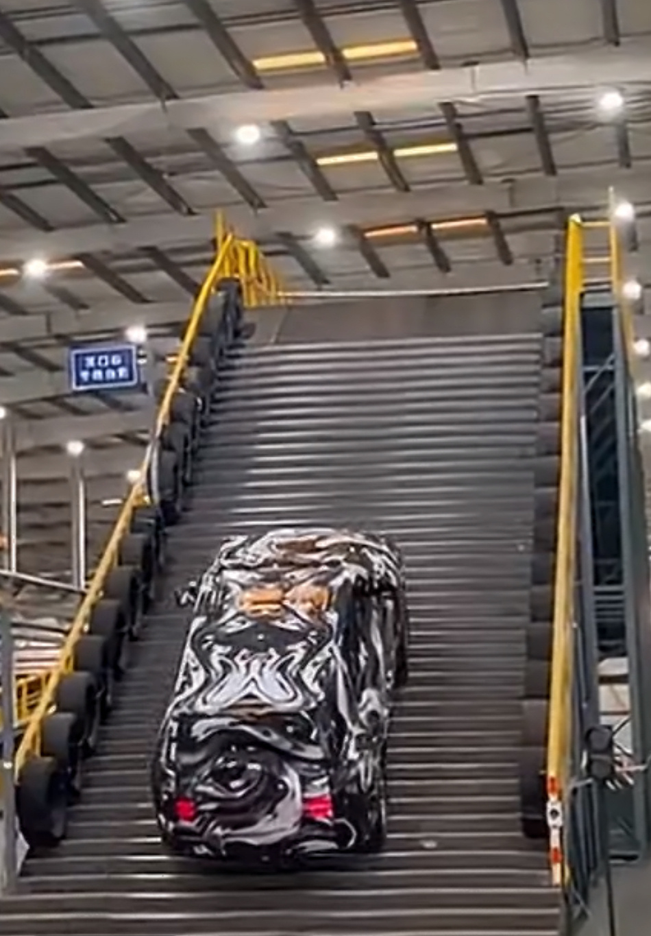 比亚迪把天门山天梯搬进了厂房其实,以比亚迪的技术,爬这种坡,倒不算是什么很大的难题。倒是视频里的测试车,虽然贴满了伪装膜,但也有细心媒体发现,伪装车的车尾小书包虽然是圆形,但很可能是U8八边形备胎罩贴了伪装,因为差不多大的豹8是星环造型,贴不成这么规整的圆形。