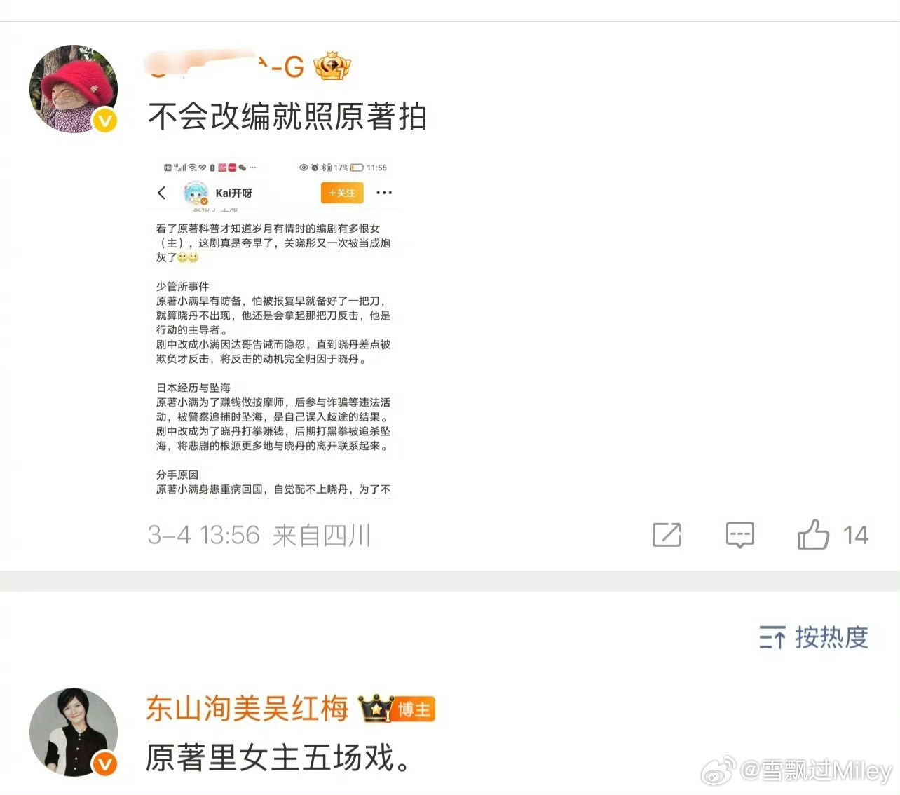 关晓彤岁月有情时戏份关晓彤严晓丹 说原著女主只有5场戏,那怎么不按照原著拍呢?原著张小满是为了严晓丹去的日本吗?你给关晓彤的剧本是按照原著的5场戏拍的吗?现在说原著是不是搞笑了。我为了这部剧的热度怎么多集片头片尾都没有快进,每天发评论互动。所以现在看完心情是很低落的。只希望以后关晓彤少接群像剧吧,只会被当成工具人。