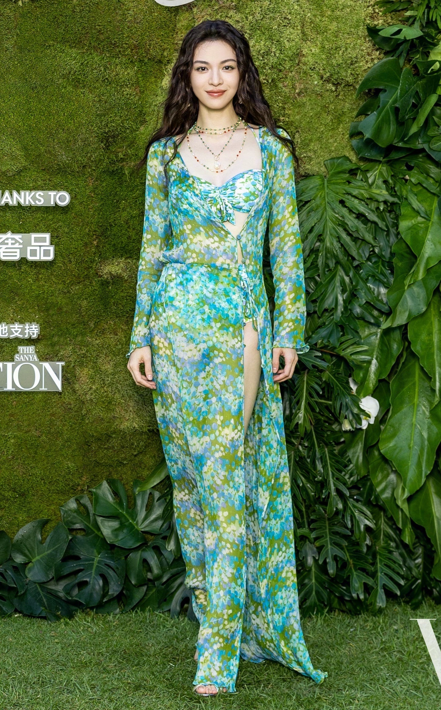 钟楚曦给我滴精华了钟楚曦沙滩碎花高开叉长裙大长腿光jio玉足配银色绑带细高跟