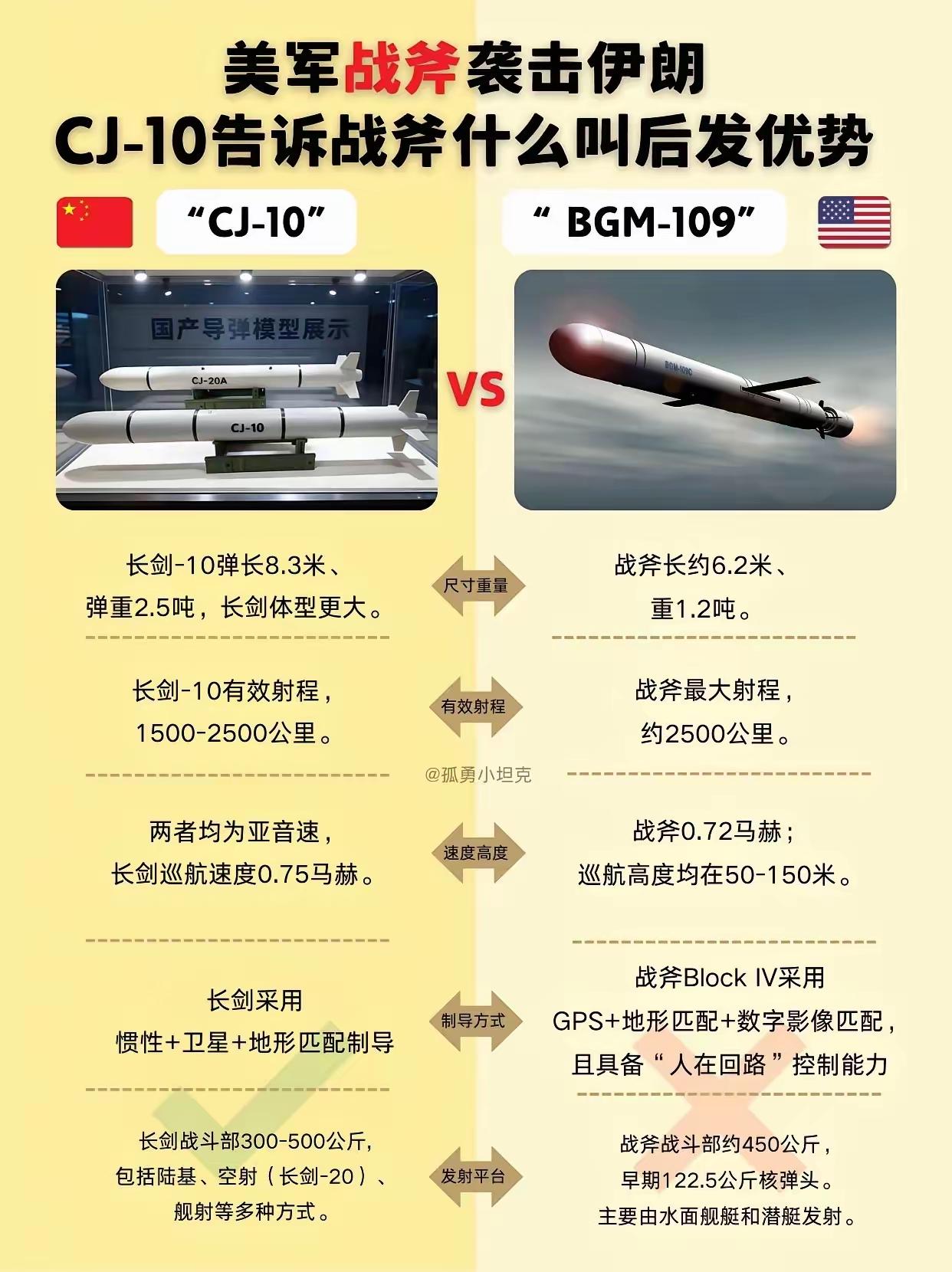 东大的CJ-10巡航导弹和鹰酱的“战斧”巡航导弹对比如下。我们虽然起步晚,但是我们后发优势,长剑10巡航导弹在整体性能上超越美军战斧巡航导弹。不过我们也不能盲目自信,战斧巡航导弹的实战能力和表现是我们无法比拟的。反舰巡航导弹