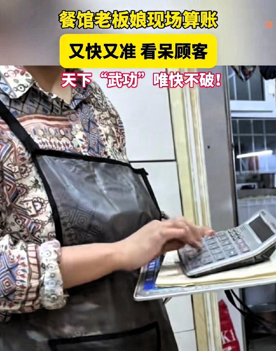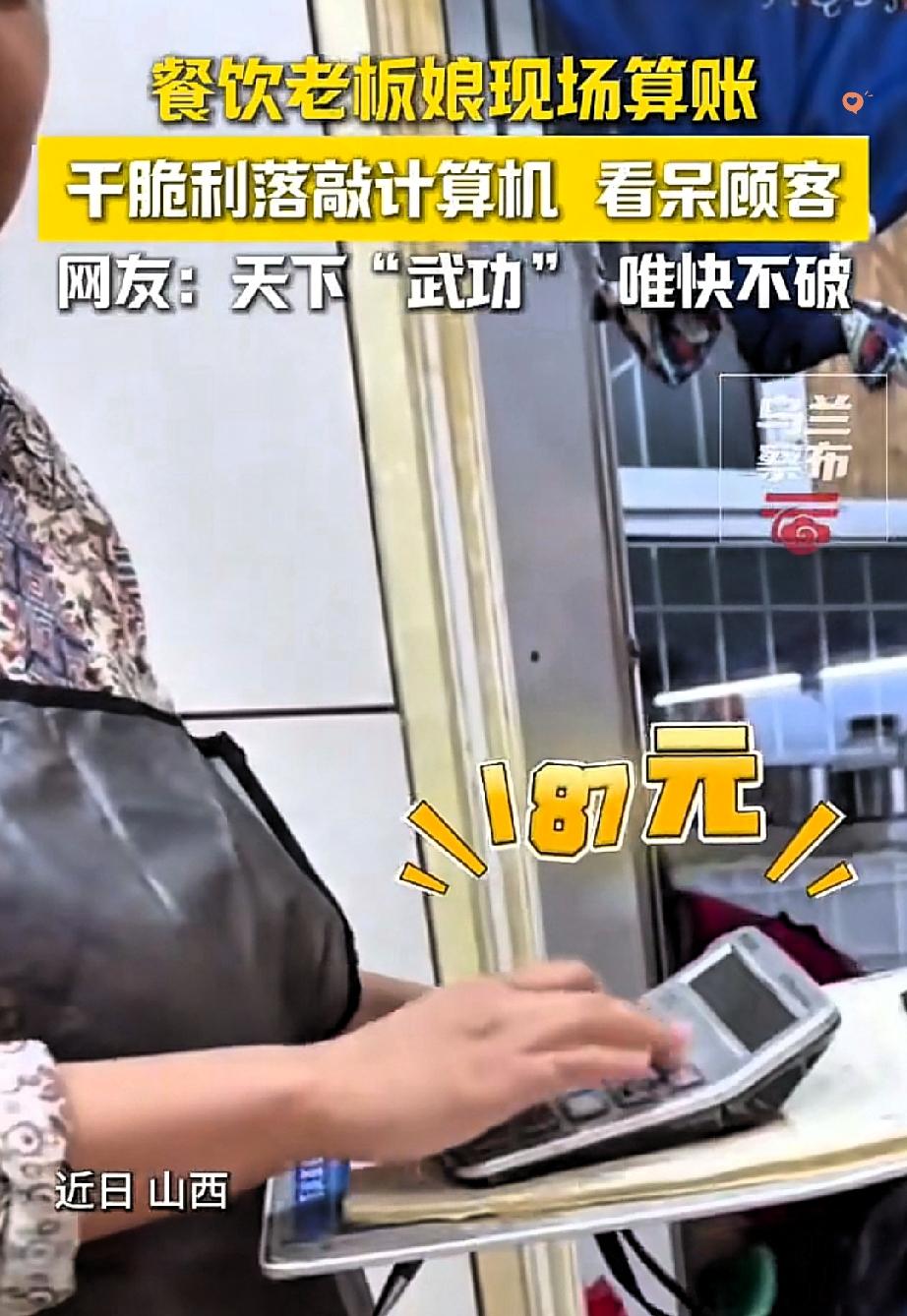 山西大同老板娘这波操作,直接把“熟能生巧”焊死在天花板上! 人民日报都转发点赞,这哪是算账,分明是民间隐藏的“指尖高手”。 顾客喊买单后刚倒上茶,想着慢慢喝等结账,结果老板娘眼睛扫着桌面报菜数,手在计算器上翻飞如舞。 11个菜、7碗饭加饮料,不到10秒就报出187元,怕顾客不放心还当场复核,分毫不差。 这哪是单纯的盲打,是日复一日记价格、练指法的沉淀,是把平凡工作做到极致的较真。 网友说她屈才不去银行,却不知小店烟火气里的专注,才最见真功夫。 真正的厉害从不是天赋异禀,而是把重复的事做到精准,把普通的活干出光彩。 你身边有没有这样把本职练成名场面的普通人?