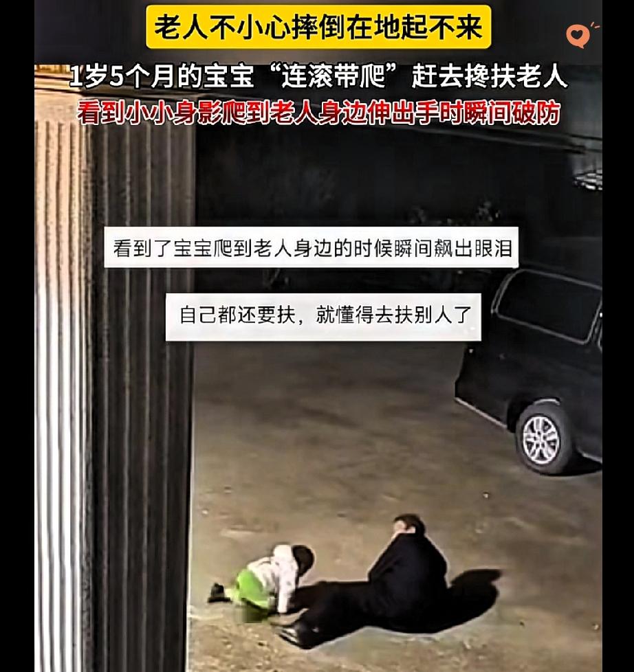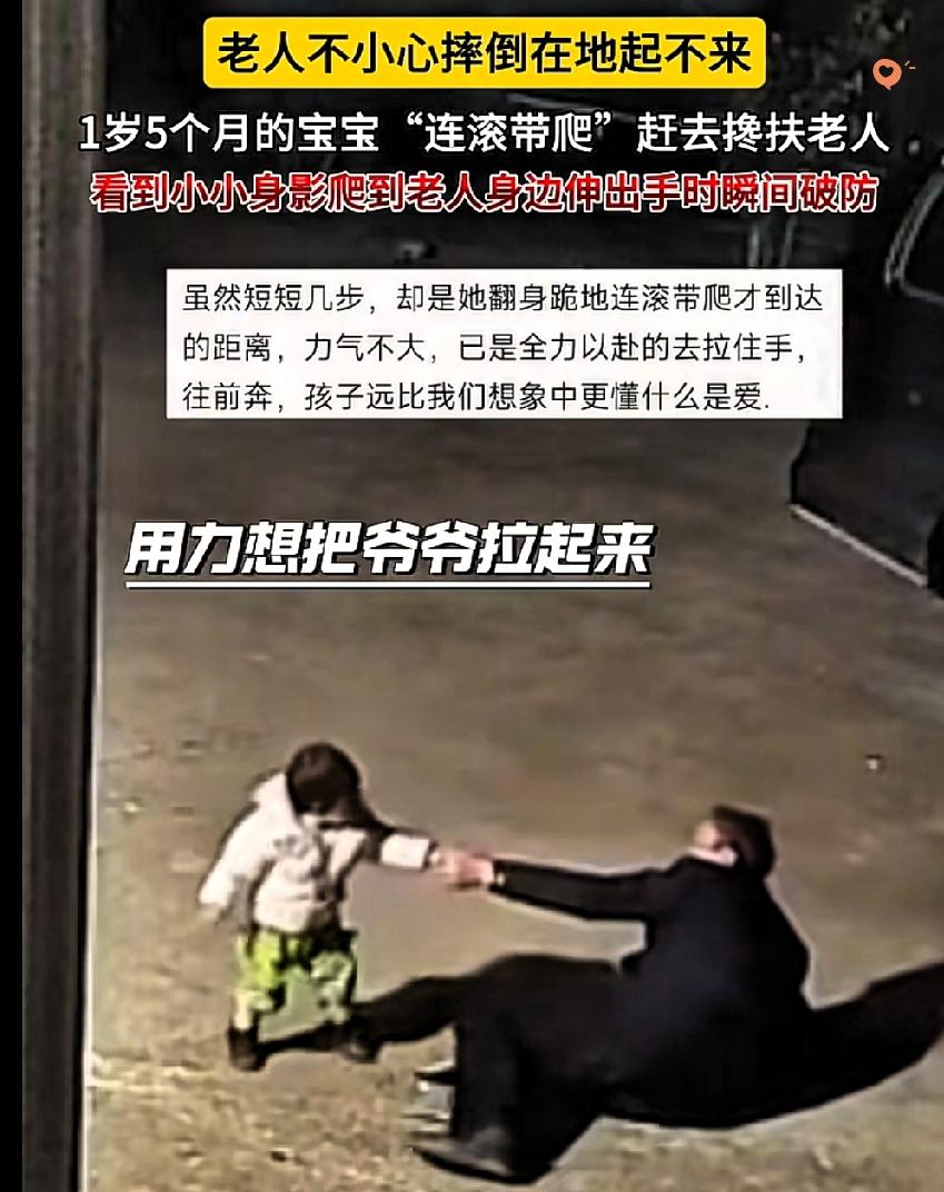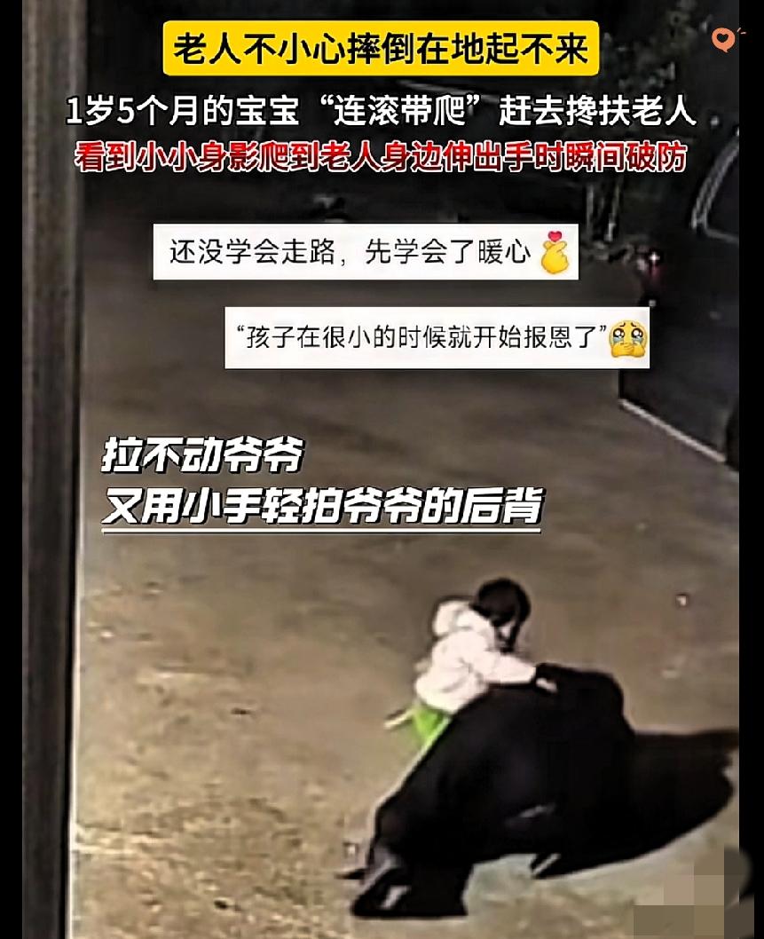 天津这1岁半娃的操作,直接戳中了所有人的泪点! 这哪是什么小不点,分明是爷爷的小守护神,刻在骨子里的亲情,真的藏不住。 元宵佳节,爷爷上台阶时不慎摔倒,躺在地上动弹不得。 屋里的小孙女瞧见了,走路还摇摇晃晃的她,立刻坐到地上倒着爬下台阶,连滚带爬冲向爷爷。 到了爷爷身边,她小手紧紧拽着爷爷的手,还不忘去扶爷爷的背,使出浑身力气想把爷爷拉起来。 那小小的身影,满是着急和坚定,看得人心里又暖又酸。 都说言传身教是最好的家风,这孩子连话都说不明白,却用最本能的行动诠释了什么是血脉相连。 孝顺从来不是长大后的刻意学习,而是藏在日常点滴里的耳濡目染。 你家娃有没有过这种不经意间戳中你心窝的暖心瞬间?