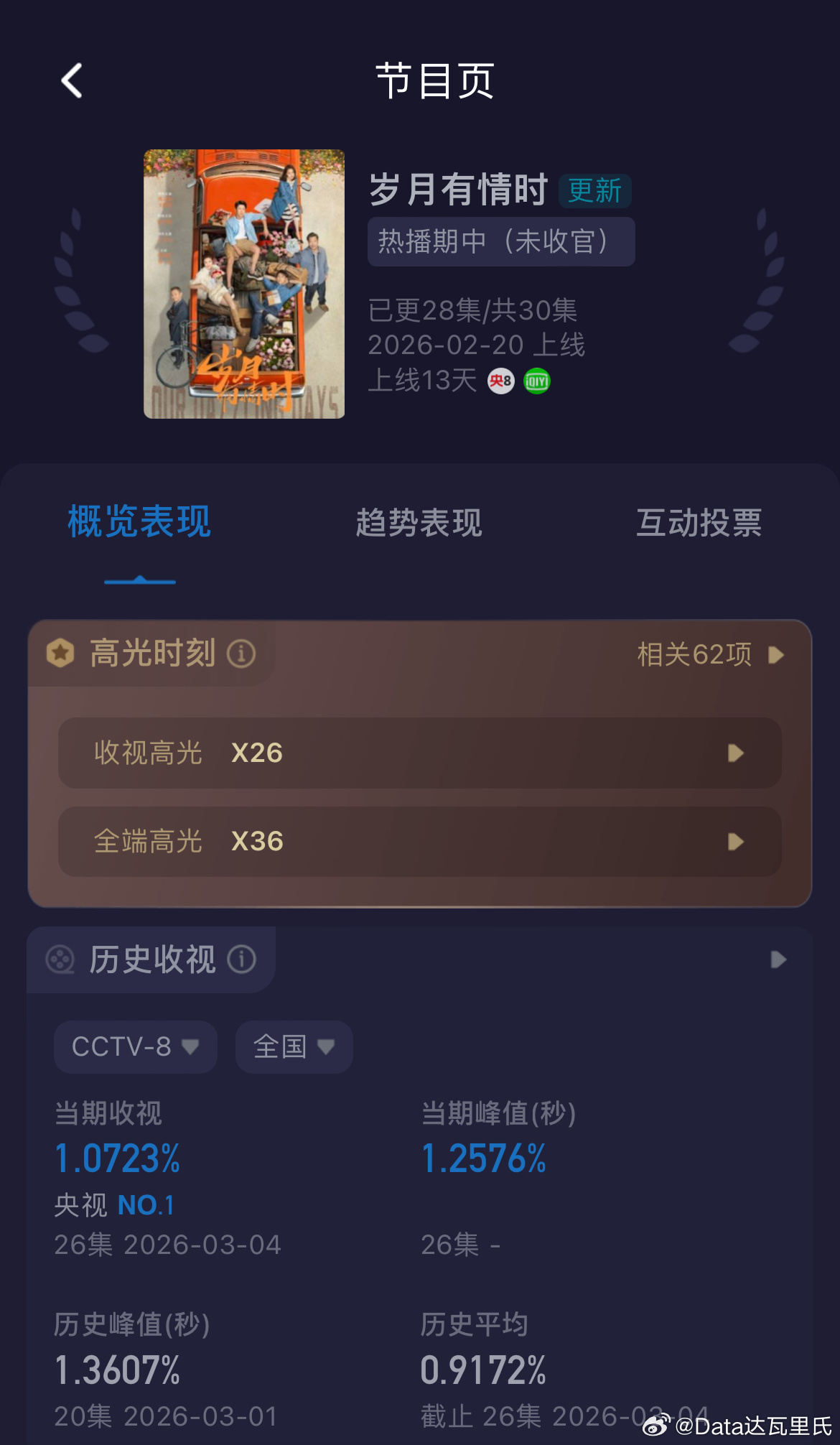 岁月有情时收视率 傍晚档今日酷云收视率破1,1-24集均收视0.9172%