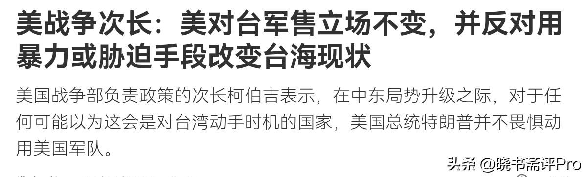 陷在中东还不算,美国竟然对我们放狠话,绝不允许我们轻举妄动!3月4日,根据法新社报道,美国战争部负责政策的副部长柯伯吉表示,在中东局势升级之际,对于任何可能以为这会是对台湾动手时机的国家,美国总统特朗普并不畏惧动用美国军队。美国确实需要在国防工业基础上加倍努力,但目前已取得进展,任何人都不应有所误解,情况已在美国掌控之中。 柯伯吉声称,美国近50年来的立场是对台湾提供防卫性武器,并反对使用暴力或胁迫手段改变现状,而当前政策与此相符。但对于110亿美元的军售问题,柯伯吉并未回答。很显然,尽管现在美国陷在跟伊朗的军事冲突之中,但是美国官员的这一番放话,明显是在警告我们。 该官员的意思很清楚,那就是中国不要以为现在是有机可乘的机会,一切尽在美国的掌握之中,中国最好是不要低估了美国的能力。而其在台湾问题上,仍摆出一副挑衅我们的架势。为什么此人此时专门要发表一番这样的言论呢?从根本上来说,美国就是意在震慑我们,警告我们不要此时此刻轻举妄动。 美国放狠话,搞震慑。但是,从我们的角度而言,这样的狠话,对于我们毫无意义。对于正在发生的冲突,我们会密切关注美国的表现。而对于台湾问题,我们寸步都不会让。不管美国打什么样的算盘,我们都必定会解决台湾问题。事实上,美国在中东已经呈现外强中干的一面,美国被伊朗反击的狼狈,各国都看得见。美国当然也别低估了我们的决心和坚定意志。