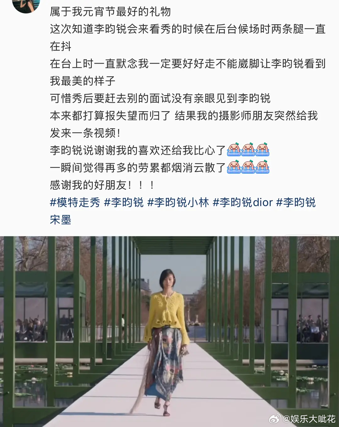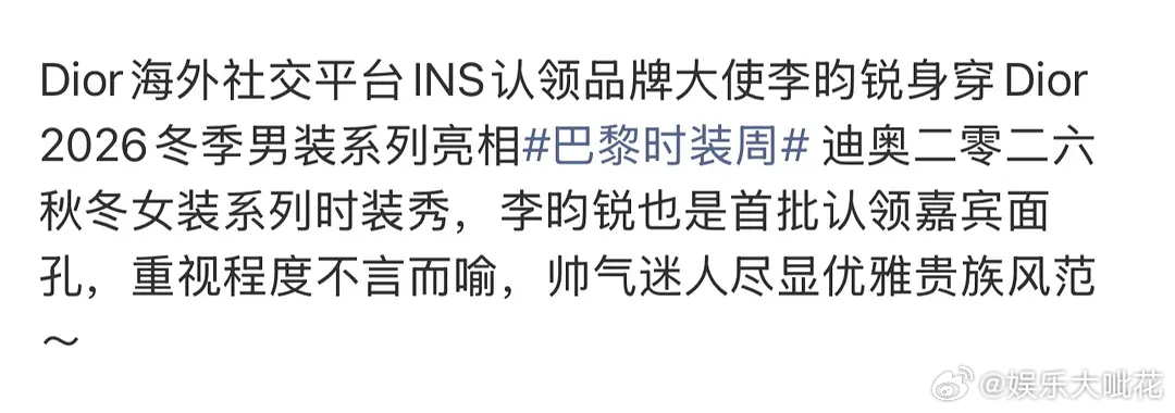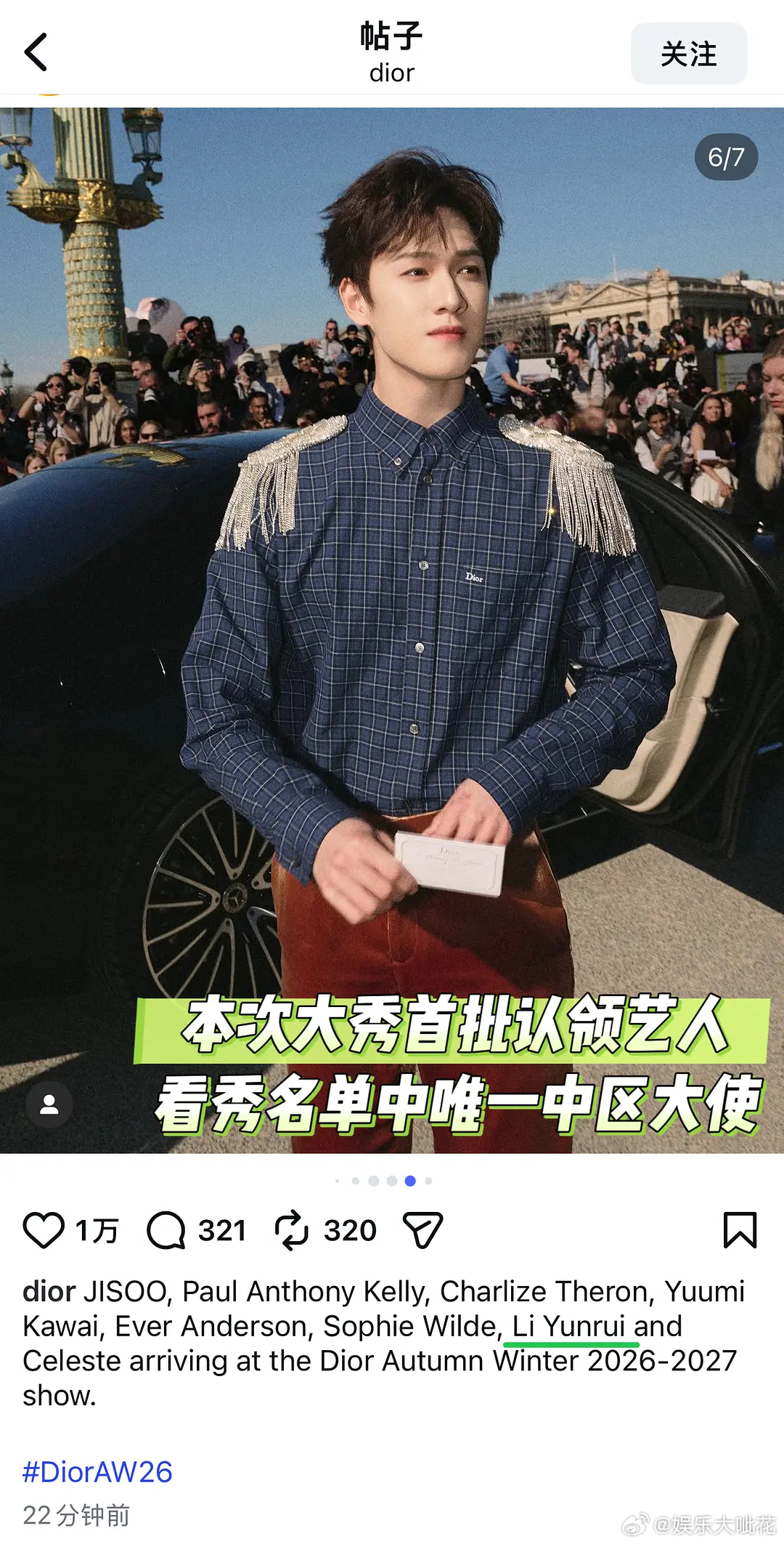 本次DIOR大秀ins首批艺人认领名单来了 看秀名单中唯一中区大使李昀锐大秀首批认领艺人+ 接管官博+最新26秋冬超超季上身+秀前单人机位物料循环,真的待遇超好啊