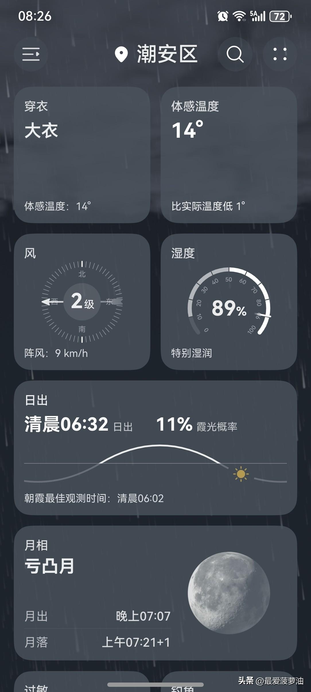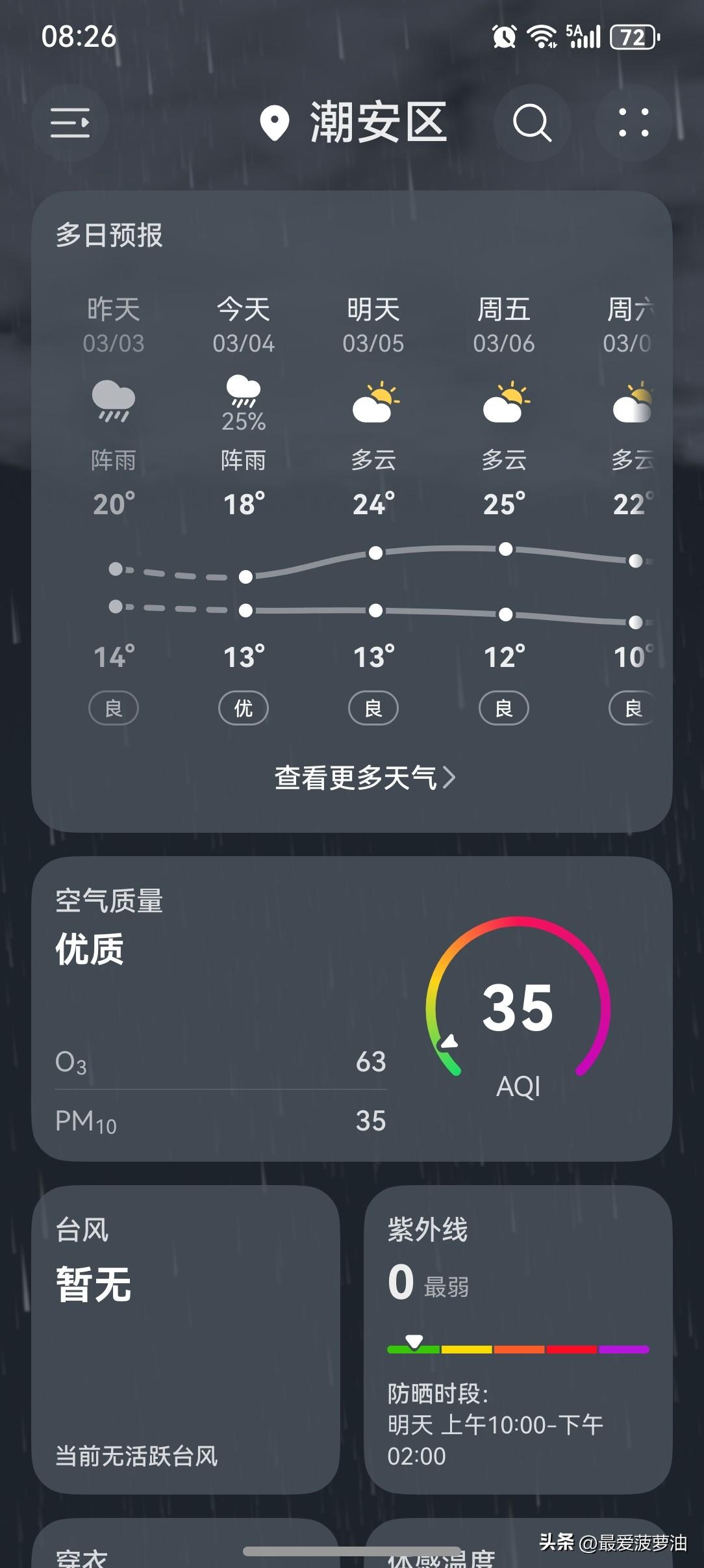广东降雨减弱,雨水处在收尾阶段啦! 今天(4日),粤西和珠三角南部仍有小到中雨,粤东有小雨,其余市县阴天为主有分散小雨;5~7日有弱冷空气补充,我省云量明显减少,日较差增大,6~7日我省大部晴间多云。 今天(4日),潮州有阵雨,气温13~18℃,此刻气温15℃,体感温度14℃。 今天的气温算是近期来比较低迷的,全天最高气温只有18℃,再加上雨水的暴击,体感又增添了几分寒意。 今天一整天,断断续续又下了不知道多少雨,虽然都是小雨,但架不住数量实在是太多了!下了一场?两场?三场?四场……大概是N场吧! 而就在刚刚,又噼里啪啦地下起了雨来!同时,窗外的鞭炮声也通天彻响! 如此一来,又是雨声与鞭炮声齐鸣的夜晚!妙哉!妙哉! [我想静静][捂脸][笑哭][大笑][我想静静][捂脸][笑哭][大笑]