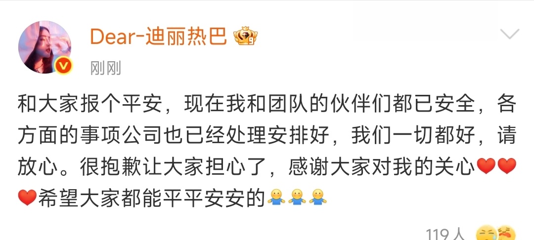 迪丽热巴很抱歉让大家担心了迪丽热巴感谢大家关心 太好了!迪丽热巴报平安了,姐姐还说抱歉让大家担心了,呜呜希望其他同胞也平安回家