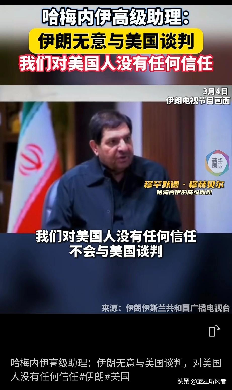 伊朗这波表态,够硬! 伊朗已故最高领袖哈梅内伊的高级助理穆罕默德·穆赫贝尔,今天(3月4日)在电视上直接把话撂下了:伊朗无意跟美国谈判,战争“想打多久就打多久”! 他说,美国不是想占领伊朗,而是想分裂伊朗。伊朗不信任美国人,也根本没打算谈。 这话听着耳熟不?他直接拿1980年到1988年的两伊战争举例子,那场仗一打就是八年。意思很明白:我们伊朗人,最不怕的就是耗! 这态度,真是把“硬气”两个字写脸上了。面对超级大国,一点不怂,直接把“不信任、不谈判、不怕打”三不原则甩出来。看来,这场博弈,还远没到尽头。