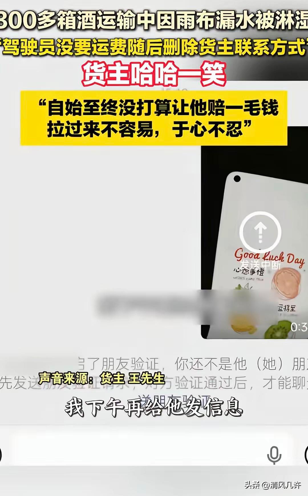 “老板大气!”安徽,男子找一货车司机运送345箱酒,送到后,他掀开雨布发现最少有300箱酒被淋湿,司机说:340元运费我不要了,你看咋弄吧。然后,开车走了。等男子给司机发信息协商时,不料,对方竟然把拉黑,微信也删除了。男子无奈,哈哈一笑说:我从来没打算让他赔一毛钱。之后,说了一番话令人感动。网友:司机格局小了。 这批酒水是货主王先生备货的核心货品,整体价值超出普通家庭全年的稳定收入,运输途中雨布出现破损,雨水持续渗入车厢,大量货品外包装受潮变形,内在品质也受到直接影响,几乎失去正常流通的价值。 参与运输的司机是宿州本地从业者,长期依靠零散货运支撑家庭开销,面对超出自身承受能力的货物损失,他找不到更合适的应对方式,只能提出放弃340元运费的处理方案,仓促驾车离开现场。 司机离场后,内心的焦虑不断加剧,他没有能力承担货品赔偿,也不知道该如何与货主沟通,恐惧与无助交织在一起,最终做出删除微信、拉黑电话的选择,用逃避的方式回避这场突发的意外。 司机的行为看似不负责任,背后却是底层从业者面对大额损失时的本能反应,他没有想过主动协商,更没有理解货主原本的态度。 王先生发现无法联系司机时,没有产生任何追责的想法,也没有打算通过货运平台、法律途径挽回自身经济损失。 他常年与运输群体打交道,清楚货车司机的真实生存状态,不分昼夜奔波在运输线路上,要应对复杂路况与多变天气,收入仅能维持家庭基本开支,一次意外赔偿足以让整个家庭陷入经济困境。 王先生从查验货物损失的那一刻起,就确定了不追究责任的决定,这份决定不是随意的妥协,而是对普通劳动者生计的真切体谅。 身边的亲友、员工都提出不同建议,有人主张按行业规则追责,减少自身损失,有人认为司机逃避责任的行为应当受到约束,这些建议都被王先生一一拒绝。 王先生清楚创业与谋生的双重不易,他自己经历过资金周转紧张、意外突发的困境,懂得普通人面对无法预知的损失时的无力感。 他不愿用既定规则去为难一个为生活奔波的人,更不愿让一次意外毁掉他人的生活根基。他面对外界询问时明确表示,运输从业者挣的都是血汗钱,不能因为一场意外就把人逼到无路可退。 王先生独自承担了全部货物损失,他组织员工对受潮酒水逐一分类整理,能够二次处理的货品调整销售方式,无法流通的货品自行留存,全程没有向司机提出任何赔偿要求,也没有再尝试联系对方。他没有刻意宣扬自己的做法,只是用最朴素的行动,守住了内心的善良与做人的厚道。 这件事在网络传播后,引发大量网友的深度共鸣。 众多货车司机分享自身从业经历,提及遭遇货主严苛追责时的窘迫与绝望,他们纷纷称赞王先生的体谅,是对底层劳动者最直接的尊重。网友们普遍认可,司机的逃避源于赔偿恐惧而非主观恶意,王先生的包容才是真正的格局,这份善意的价值远高于受损货品。 当下社会中,利益纠纷容易催生对立情绪,很多人习惯紧盯自身损失,用严苛标准要求他人,却忽略了彼此谋生的艰难。王先生的做法打破了功利化的相处逻辑,他用实际行动证明,人与人之间的稳定联结,从来不是利益的精准权衡,而是将心比心的理解与包容。 王先生依旧维持着原本的经营状态,日常依旧与各类运输从业者保持顺畅合作,这次意外没有改变他对他人的信任与体谅。他始终坚持,出门打拼的人都有各自的难处,多一份包容就能少一份对立,多一份善意就能多一份安稳。 这件事没有复杂的纠纷,没有激烈的争执,只是普通人之间的一场意外与包容。 它让更多人看清,平凡生活里最珍贵的不是财富积累,而是利益面前守住的良知,是他人困境中给出的体谅。善良从不是刻意的表演,而是融入选择里的真诚与厚道。 各位读者你们怎么看?欢迎在评论区讨论。