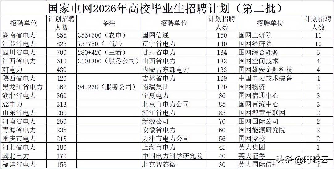 赢在起跑线!国家电网招聘第二批招聘人数汇总揭秘!报名攻略:选对赛道,赢在起跑线!2026国网二批招聘计划新鲜出炉,这波岗位“蛋糕”到底怎么分?@叮咚云 帮你解读重点和职业指导:看完这份数据,直接帮你把报名难度和上岸概率算得明明白白!🔥🔥🔥🔥 [礼物][礼物]从图里看,湖南、江苏、四川这三省简直是“招聘卷王”,计划人数直接飙到700+,妥妥的“岗位大户”。湖南855人、江苏825人、四川700人,这数字看着就让人眼冒金光,仿佛上岸的大门都为你敞开了一条缝。而像英大集团、英大证券这些单位,招聘人数直接“个位数起步”,堪称“地狱难度副本”,没点真本事真不敢轻易碰。[赞][赞] [福][福]要说报考哪个地区最合适?那必须是“岗位多、竞争相对温和”的宝藏省份。江西610人、XJ电力430人、陕西420人,这些地方不仅名额充足,还藏着不少“服务公司”“农电”的扩招名额,简直是“捡漏天堂”。当然,如果你是“天选之子”,也可以挑战一下北京、上海这些“一线城市副本”,虽然名额少,但平台高,一旦上岸,直接“赢麻了”![烟花][烟花] 记住,“千淘万漉虽辛苦,吹尽狂沙始到金”,只要你专业对口、实力过硬,就别怕竞争激烈。“黄沙百战穿金甲,不破楼兰终不还”,冲就完事儿了!赶紧锁定目标,全力备考,早日拿到心仪的offer,开启你的“金饭碗”人生![点亮平安灯][点亮平安灯] 欢迎关注@叮咚云 将优先为粉丝职业规划指导,为你定制最适合的就业择业方案!欢迎留言交流讨论。[来看我][来看我] 免责声明:图片来自网络,仅供参考 国家电网求职 国网提前批招聘 电网招考