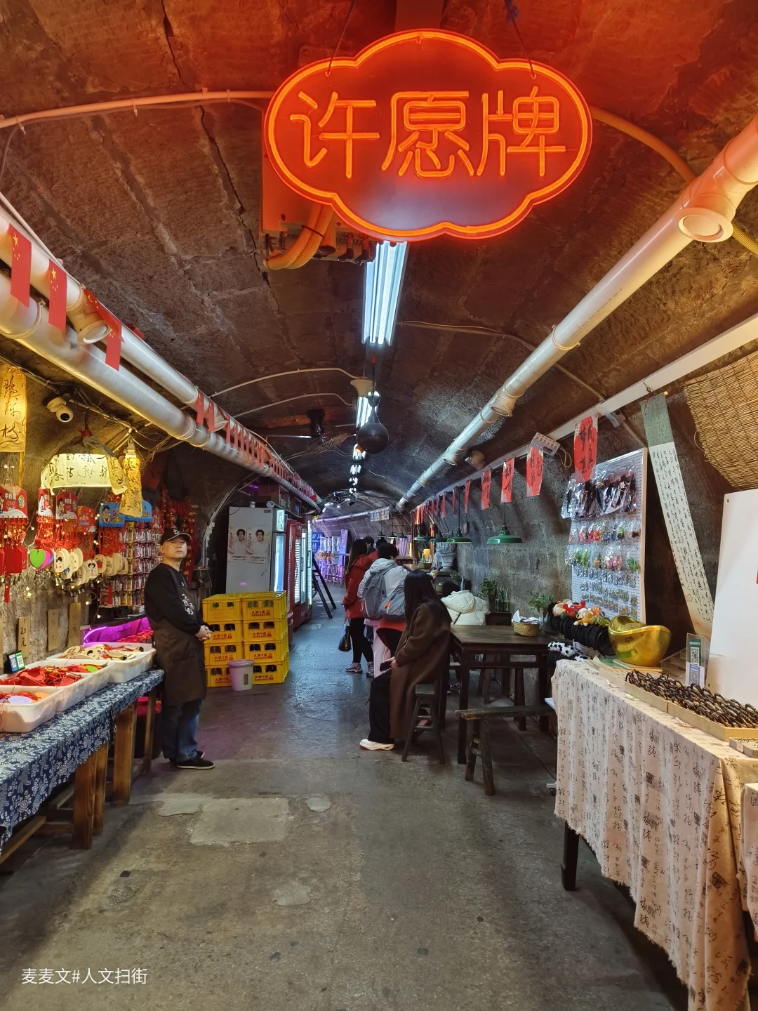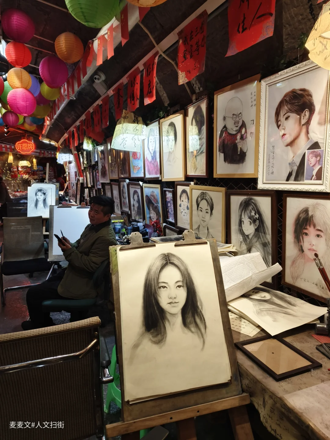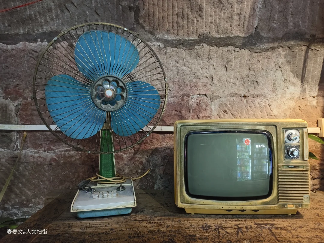 走进洞内,恒温的空气让人瞬间卸下疲惫。一侧是挂满肖像画的画室,画师正低头创作,墙上的明星画像和老照片,诉说着山城的故事。另一侧则是充满烟火气的茶座,老木桌、旧风扇、复古电视机,每一件老物件都能勾起一代人的回忆。