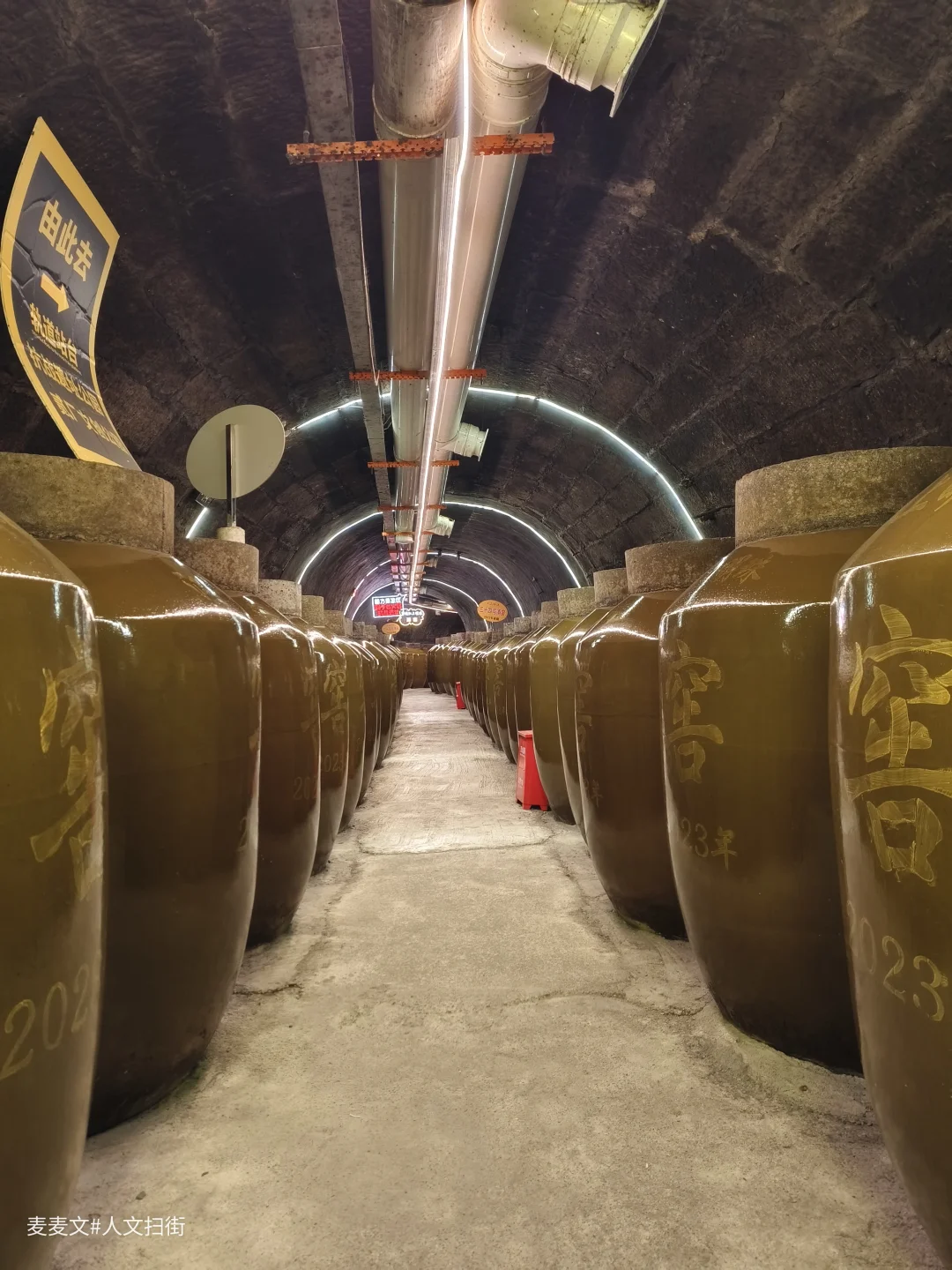 继续往里走,霓虹闪烁的“时光隧道”和挂满红灯笼的通道,营造出梦幻又复古的氛围。而深处的江上明珠酒窖里,一排排近几年窖藏的酒坛整齐排列,酒香与历史的厚重感交织在一起。