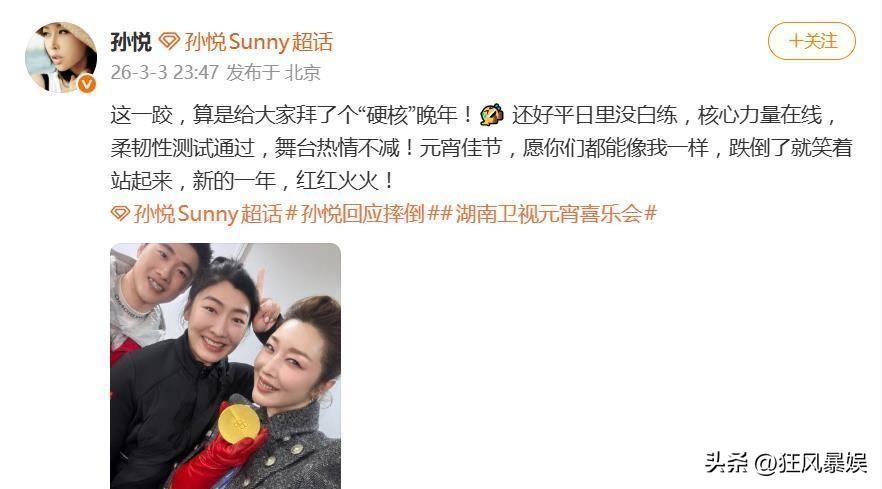 孙悦,元宵晚会险出事故,本人火速回应,网友笑了又哭了! 3月3日晚,湖南台元宵晚会上,出现了一个小插曲,歌手孙悦在唱经典名曲《大家一起来》时,突然发生意外,观众吓坏了,纷纷直呼:老一辈的艺人临场经验就是强! 歌手孙悦在唱《大家一起来时》,因为舞台湿滑,孙悦一脚踩空,重重摔在地上,那一刻,观众的心都提到嗓子眼了,但接下来的一幕让观众从揪心变成了敬佩,被扶起来后,她无缝衔接,继续高唱《大家一起来》,笑容没断,气息没乱,甚至还高喊一声“没事,安全”。 事后,她还发文:“这一跤,算是给大家拜一个「硬核」的晚年”! 这段视频在网上疯传,网友纷纷表示:“专业”、“敬业”、“反应快”,还有人调侃:“这是把摔倒也编排进舞蹈了”、“53岁还这么拼,我20岁都不好意思喊累了”。 不过,调侃归调侃,最动人的不是“拼”,而是把意外变成表演一部分的从容,摔倒后无缝衔接,是排练不出来的,而是几十年的舞台经验沉淀出来的肌肉记忆,是一个职业歌手对“表演必须完整”的坚守。