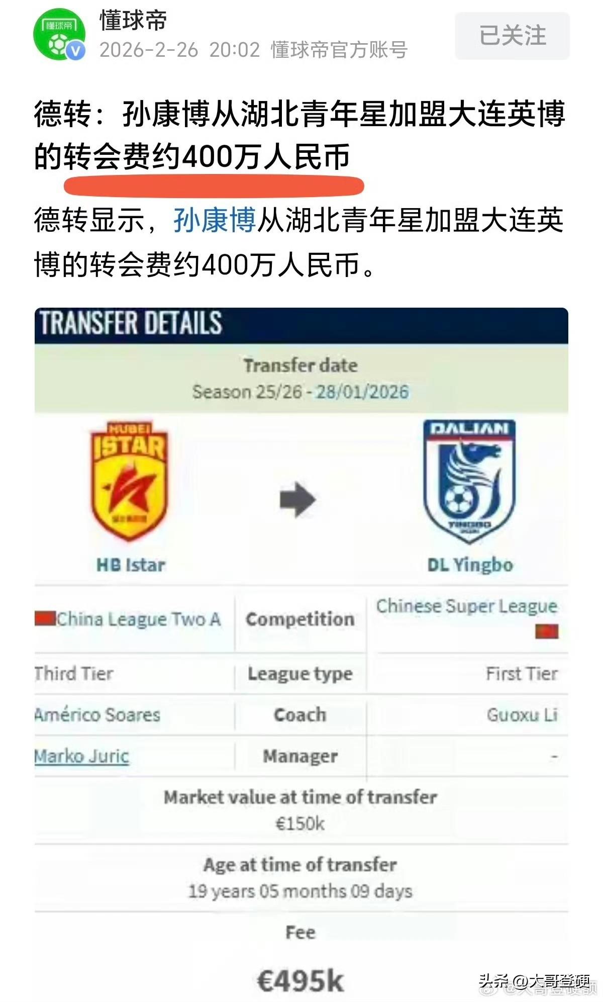 坐等官宣!09国少高中锋张柏霖,即将加盟湖北星辉,新赛季将征战中乙联赛[击掌] 北京时间3月4日晚,据多位足球媒体人透露,09国少高中锋张伯霖,即将加盟湖北星辉,新赛季将征战中乙联赛[加油] 作为09年龄段的优秀高中锋,张伯霖及其家人的选择,毫无疑问是明智的,先适应职业联赛的节奏,获得稳定的出场时间,得到充分的锻炼,这才是第一位的[赞] 同样是09年龄段的小球员,有的踏踏实实,为了能够踢上比赛做出合理的选择,有的好高骛远,为了中超、中甲的虚名而做出不合理的职业规划,差距显而易见[叹气] 众所周知,湖北星辉对于年轻球员的培养和职业规划,在足球圈内是远近闻名,今年国内足坛冬窗转会市场上的有两笔关于年轻球员的重磅交易,出自湖北星辉之手[赞] 一笔是19岁的姚浩洋,加盟中超重庆铜梁龙队,转会费为85.5万欧元,约合700万人民币[奋斗] 另一笔是19岁的孙康博,加盟中超大连英博海发队,转会费为49.5万欧元,约合400万人民币[给力] 还有更重磅的万项留洋塞尔维亚,正式加盟贝尔格莱德红星,这些都给年轻球员做出了合理的职业规划[赞] 只要张伯霖在中乙联赛打出数据,国内俱乐部潜在的下家必将排队上门,求贤若渴,因为高中锋目前是国内足坛的稀缺品,湖北星辉必定会下大气力去打磨张伯霖[击掌] 如果张伯霖展现出来足够强的实力,湖北星辉也会像万项一样,不遗余力将他送出去留洋[加油] 不得不说,目前这个年龄段,张伯霖选择加盟湖北星辉,确实是一个非常明智的选择[赞]