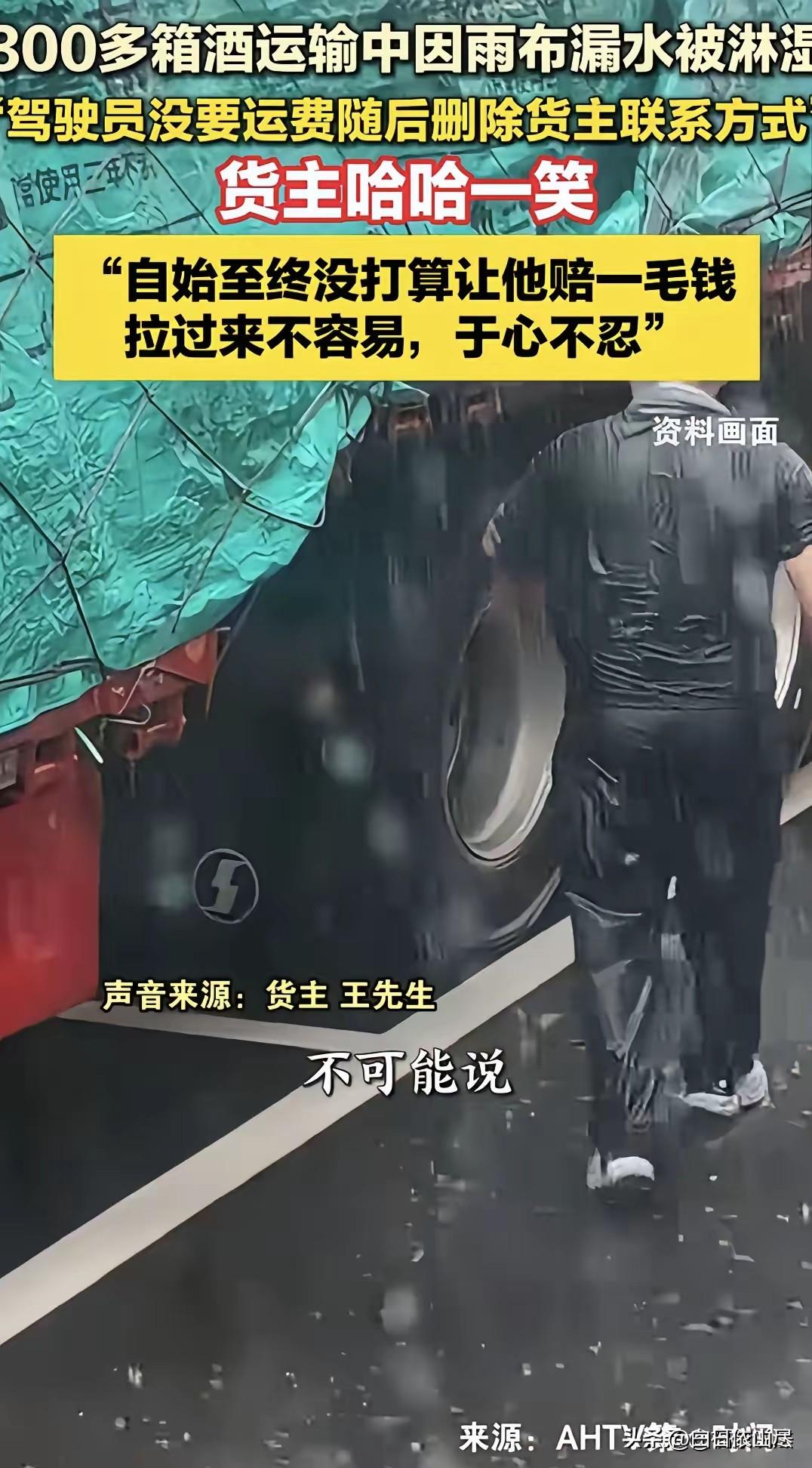 “老板大气!”安徽,男子找一货车司机运送345箱酒,送到后,他掀开雨布发现最少有300箱酒被淋湿,司机说:340元运费我不要了,你看咋弄吧。然后,开车走了。等男子给司机发信息协商时,不料,对方竟然把拉黑,微信也删除了。男子无奈,哈哈一笑说:我从来没打算让他赔一毛钱。之后,说了一番话令人感动。网友:司机格局小了。 安徽一男子需要将一批酒水发往指定地点,总计345箱,为了保证货品安全准时送达,他提前联系了一位经验看起来还算丰富的货车司机,双方谈好运费340元,装车、检查、封车一切顺利,男子本以为这会是一趟平稳的运输,却没想到,抵达目的地后,等待他的是一场意外。 车辆停稳后,男子第一时间走到车厢旁,伸手掀开覆盖货物的雨布,眼前的景象让他愣在原地。整整345箱酒,几乎大半都被雨水浸透,粗略一数,被淋湿的箱子至少有300箱,不少纸箱表面已经发软、起皱,边缘甚至出现渗水痕迹, 若是放置时间稍长,很可能直接破损,影响里面的货品。这样的情况,无论放在谁身上,都会觉得心烦,毕竟酒水属于易碎易损品,外包装受损也会直接影响销售和存放。 货车司机表示这趟340元的运费他不要了,至于剩下的事情让男子自己看着处理。说完这句话,司机没有再多停留一秒,直接上车发动车辆,匆匆驶离了现场。 男子看着司机离开的方向,心里多少有些无奈,他原本还想和对方好好沟通,看看能不能协商一个双方都能接受的处理方式,毕竟谁都不容易,他也不想故意为难谁。 可当他拿出手机,试图给司机发消息说明情况、表达自己的想法时,却发现消息前面已经出现了红色的感叹号,他不仅被司机拉黑了联系方式,微信也被直接删除,所有能够沟通的渠道,被对方彻底切断。 他坦言,自己从最开始发现货品被淋湿时,就从来没有想过要让司机赔偿一分钱。在他看来,货车司机常年奔波在路上,风里来雨里去,起早贪黑拉货赚钱,每一分钱都是用辛苦和时间换来的,生活本就不易,他不愿意因为这件事让对方承受额外的经济压力。 虽然300多箱酒外包装被淋湿,但好在内部酒水没有破损、没有渗漏,简单处理晾干之后,依旧可以正常使用,并不会造成实质性的重大损失。 他还说,人这一辈子,难免会遇到意外和失误,得饶人处且饶人,多一点体谅,就少一点矛盾,多一份宽容,就多一份心安。 比起追究那一点损失,他更愿意选择相信对方不是故意为之,也愿意用自己的大度,换一份彼此的轻松。 这段真实又暖心的经历被分享到网上后,立刻引爆了舆论,网友们的评论瞬间刷屏,大家纷纷表达自己的看法,讨论热度居高不下。 很多网友被男子的格局深深打动,直言这样的老板实在太少,心地善良、为人宽厚,懂得换位思考,不斤斤计较,不咄咄逼人,哪怕自己蒙受损失,也优先考虑别人的不容易,这份心胸真的让人佩服。有做生意的网友表示,货主这样的处事态度,注定生意会越做越大,人品就是最好的招牌。 也有不少网友直言,货车司机的做法确实太让人失望,格局显得太小。遇到问题第一反应不是承担责任,而是用几百块运费草草了事,随后立刻拉黑删除,逃避该有的沟通,看似省下了麻烦,实则丢掉了最宝贵的诚信和口碑。跑运输靠的就是长期合作和信誉,一次逃避,可能会失去所有被信任的机会。 还有网友表示,货主的大度不是软弱,而是善良,司机的逃避不是聪明,而是自私。大家都在为生活奔波,互相理解才能走得更远,可理解永远是相互的,一方拼命包容,另一方却只想逃避,这样的关系注定无法长久。 更多网友感慨,这一件小事,完美诠释了什么叫格局。真正的大气,不是有钱任性,而是明明占理,却愿意让步;明明可以追责,却选择体谅。这位安徽老板没有说什么大道理,却用最朴素的行动,告诉了所有人什么是宽容,什么是善良,什么是成年人最该有的处事方式。 对此,你们有什么看法,欢迎评论留言~
