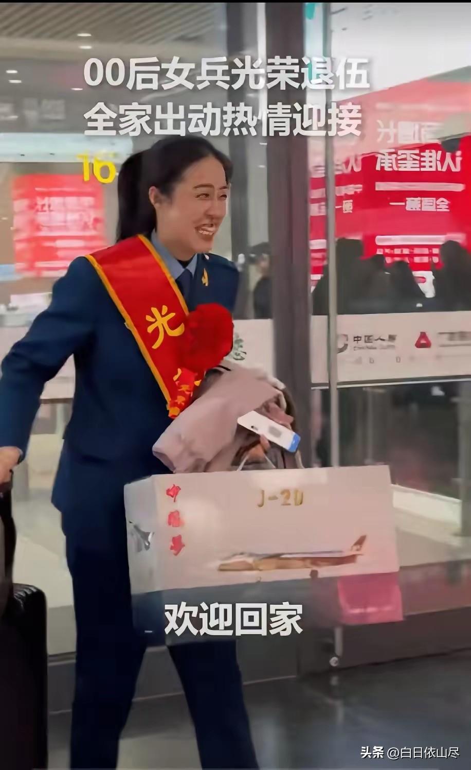 上人民日报了!浙江杭州,00后女兵退伍,原以为只是爸爸妈妈来迎接,没想到当她右手拖行李箱,左路手提J20航模到达出口时,一大家子都在出口迎接,齐声大喊:欢迎回家! 网友说:太飒了,当过兵气质就是不一样! 浙江杭州一名00后女兵结束军旅生涯光荣退伍,原本以为只有父母前来迎接,当她拖着行李箱、手提歼20航模走出到达口时,一大家人早已列队等候,整齐响亮的欢迎声,让这个历经军营锤炼的姑娘瞬间红了眼眶,这段画面一经传播便打动无数人。 退伍当天,姑娘一身简约穿搭却难掩挺拔身姿,经过军营的打磨,言行举止都透着沉稳与干练。她右手稳稳拉着制式行李箱,左手提着一架精心包装的歼20航模,这不仅是军旅生涯的纪念,更是她青春里守护蓝天的见证。 步履从容的她,心里满是对回家的期待,也以为迎接自己的只有最亲近的父母,没有丝毫预料到,一场充满爱意的惊喜正等着她。 走出到达通道的瞬间,姑娘整个人都愣住了。家族里的长辈、兄弟姐妹、亲友近二十口人悉数到场,每个人脸上都挂着期盼与骄傲,手里捧着鲜花,目光紧紧锁定在她身上。 没有喧闹的嘈杂,没有刻意的安排,当她出现的那一刻,所有人齐声喊出欢迎回家,声音整齐又温暖,在机场大厅里格外动人。 姑娘快步走向家人,长辈们上前紧紧抱住她,眼里满是心疼与自豪,兄弟姐妹围在身边,鲜花很快堆满怀抱。 从军营的坚守到家人的怀抱,从保家卫国的责任到血脉相连的温情,所有的思念与牵挂,都在这一刻化作最真实的拥抱与问候。 她手里的歼20航模格外醒目,既是军旅荣光的象征,也让这场归家之旅更具特殊意义。 这段温暖的视频被现场亲友记录下来,很快在网络上传播开来,人民日报主动转发报道,让更多人看到这份属于中国青年的荣光与家庭的温情。 网友们纷纷留言表达内心的感动,夸赞姑娘英姿飒爽,一身军人气质扑面而来,哪怕褪去军装,骨子里的挺拔与坚定依旧藏不住。 有网友感慨,这就是中国年轻人最好的样子,青春献给军营,归来自带光芒,00后用行动扛起责任,诠释了新时代青年的担当。 也有网友被家人的重视打动,全家出动迎接退伍归来的孩子,不只是简单的团聚,更是对军人职业的尊重与敬意,这样的家庭氛围让人羡慕。 还有网友注意到姑娘手中的歼20航模,直言这份纪念意义非凡,代表着曾经的坚守与热爱,也象征着逐梦蓝天的初心,退伍不褪色,这份荣光值得所有人致敬。 更多网友送上祝福,欢迎姑娘光荣退伍,愿她褪去军装后,在新的人生旅程里继续闪闪发光,带着军营里的坚韧与勇敢,走好未来的每一步。 军营淬炼青春,家人守护归途,这名00后女兵用两年军旅时光书写担当,家人用最朴实的行动传递爱意,这一幕不仅温暖了现场所有人,更治愈了无数屏幕前的网友。 平凡的瞬间里藏着最真挚的感动,青春因奉献而闪耀,亲情因牵挂而温暖,这便是属于中国人的浪漫与荣光。 对此,你们有什么看法,欢迎评论留言~