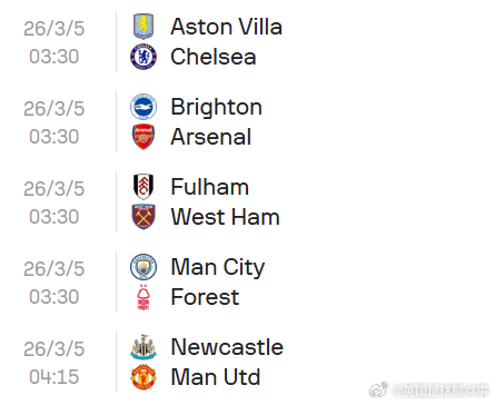 03:30 阿斯顿维拉vs切尔西 03:30 布莱顿vs阿森纳 03:30 曼城vs诺丁汉森林 04:15 纽卡斯尔联vs曼联