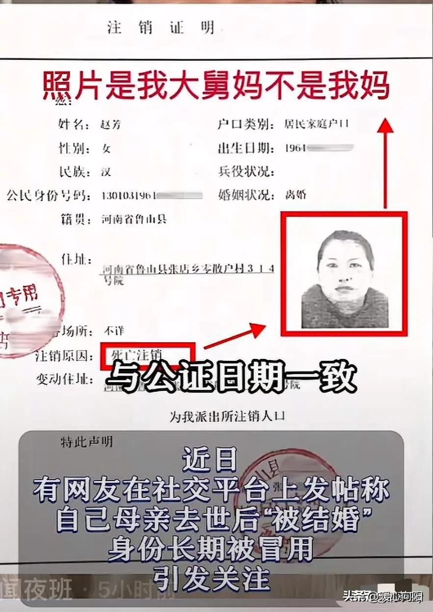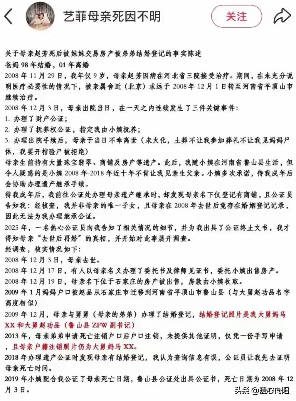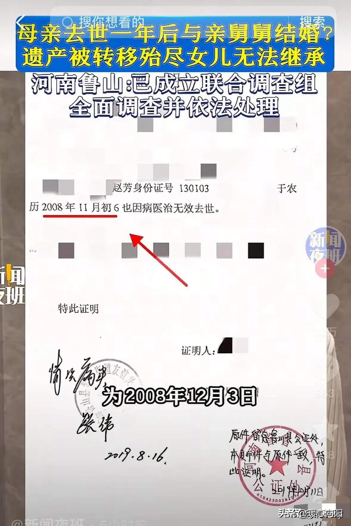 这是要吃绝户!河南鲁山小姑娘孙艺菲9岁时母亲去世,抚养权被转给小姨。10年后,女子得知母亲有房产和商户等,希望继承母亲遗产。谁知,办理手续时竟发现,母亲去世第二年,竟然又再婚,结婚对象是自己的亲舅舅,户口也没有被注销,变成了舅妈的脸。更可恶的是,母亲去世才14天,小姨就顺手变卖了母亲留下的房产。 孙艺菲的父母离婚,年幼的她跟随母亲生活。母亲有很多珠宝、商铺和房产,因为父母以前是做珠宝生意的,收入丰厚。 2008年12月,孙艺菲的母亲因病去逝,年仅9岁的孙艺菲还是个小孩子什么也不懂! 母亲去逝后,父亲想把女儿接走抚养,可是舅舅和小姨小同意,于是抚养权转给了小姨,从此张艺菲跟随小姨生活。 母亲留下的遗产由舅舅和小姨管理,并承诺等张艺菲长大后交还给她。 日子一天天过去了,2018年19岁的张艺菲去办理母亲的遗产继承权时。工作人员告诉她,她不是独生子,她妈妈有再婚并且还有孩子,不能给她办理遗产继承权。并且说她母亲名下只有一间小商铺。 张艺菲一下子蒙了,母亲明明就结了一次婚,怎么有再婚行为了。并且母亲有很多商铺及房产,现在只剩下一间小商铺。 经过调查发现2008年12月3日,母亲去世。2008年12月17日,有人以母亲名义办理了委托书及律师见证书,委托小姨出售房产。两天后,母亲名下的房产被售出,房款由小姨收取。 2009年12月,她母亲与舅舅(母亲的弟弟)办理了结婚登记,结婚登记照片是她大舅妈马 XX和大舅赵功品。也就是说身份证号是她母亲的,结婚登记照片是她大舅妈的。 舅舅和小姨伪造各种证明,侵吞了母亲的财产,现在她才明白,当时母亲去逝时舅舅和小姨不让她跟随父亲生活的原因。 孙艺菲9岁母亲去逝,己经够可怜的,没想到自己的亲舅舅,小姨联手算计她母亲的遗产。 现在事情真像大白了,河南鲁山县联合调查组,对这件事情全面调查并依法处理!