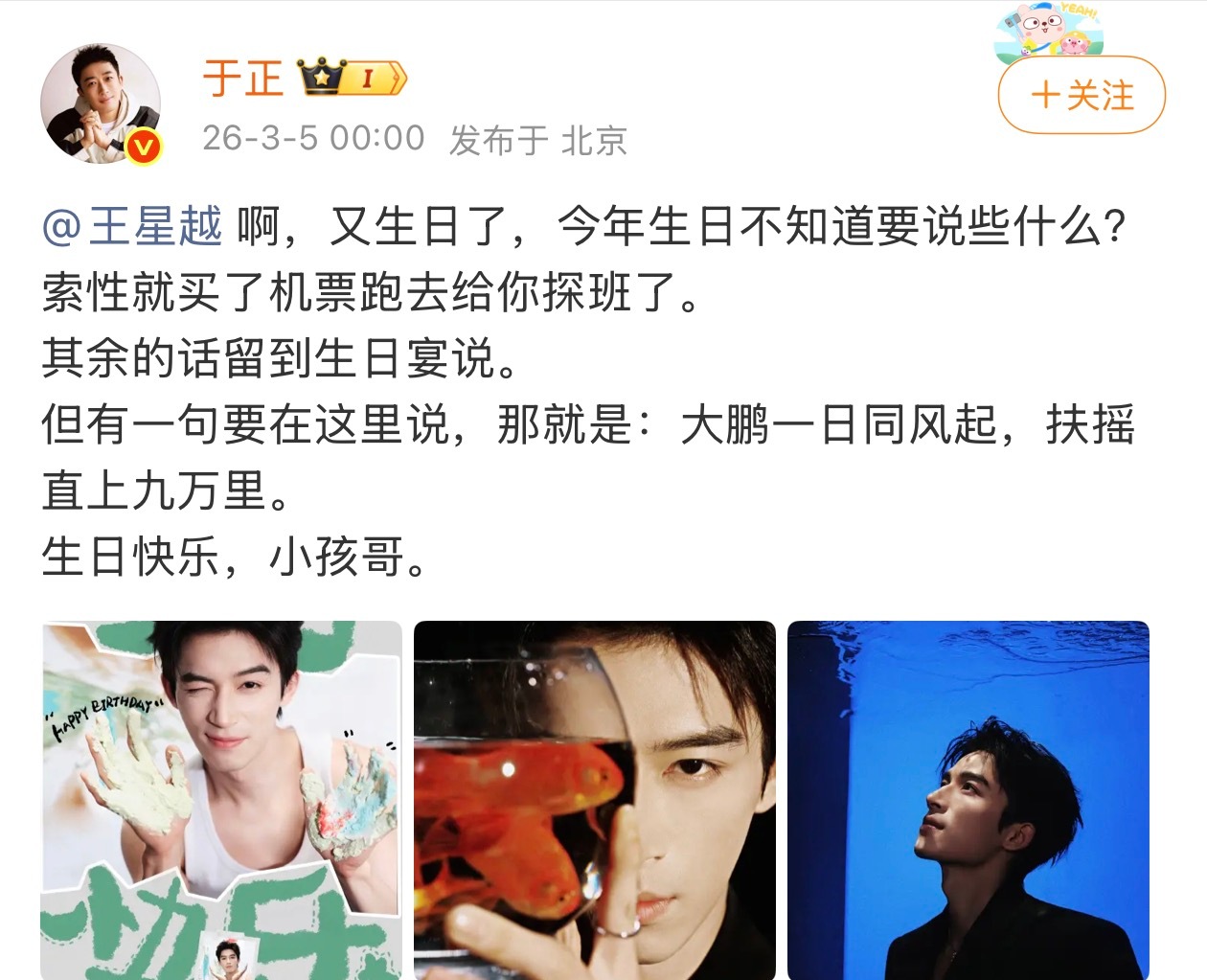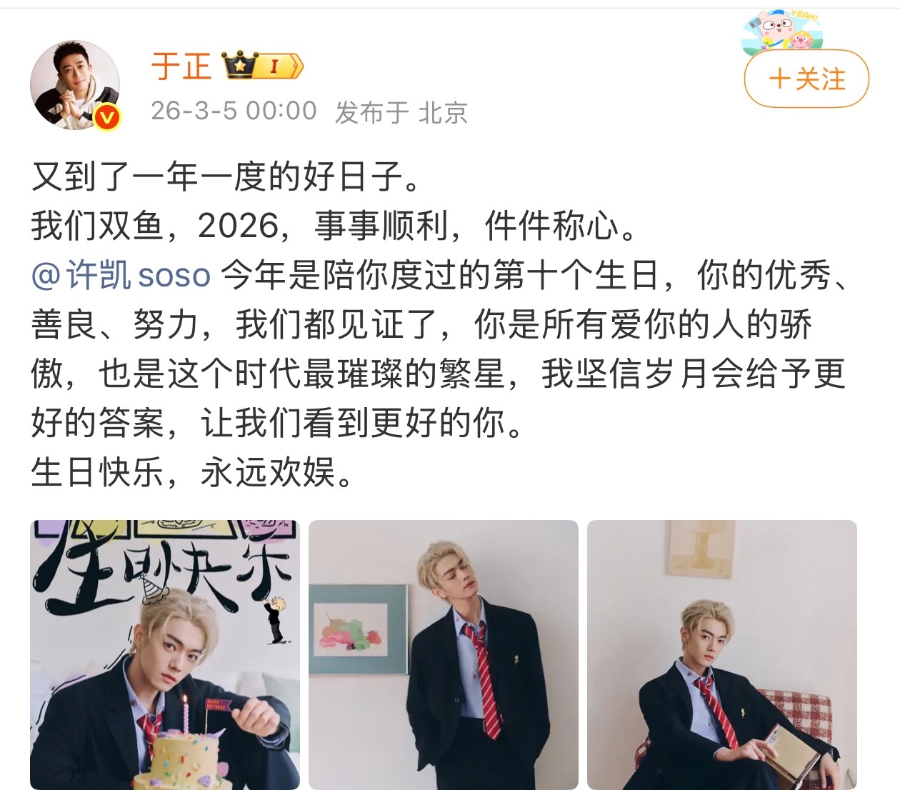 于正卡零点为王星越许凯庆生于正对许凯王星越的祝福 于正卡零点为王星越许凯庆生,快来看看于正对许凯王星越的祝福,期待两位寿星能够和我们多多见面啦!