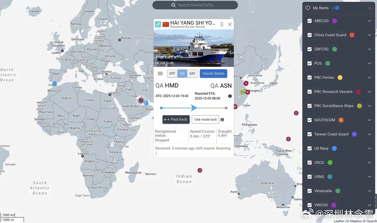 不少人问:街溜子815型侦察船现身中东?让大家失望了,815这次真没去!但我国更先进的瞭望1号(航天/电子侦察船),2月就抵达阿曼湾,至今仍在附近海域执行任务。